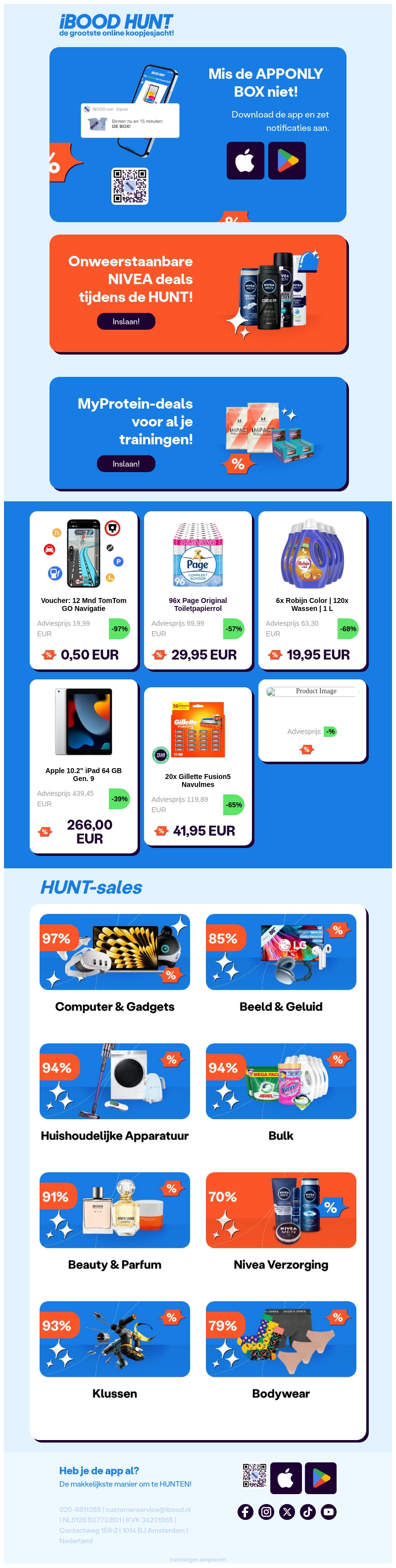 Ontdek exclusieve aanbiedingen in de APP-ONLY box tijdens de iBOOD Hunt! Mis bovendien de onweerstaanbare NIVEA-deals en MyProtein-aanbiedingen niet. Ontvang gigantische kortingen op diverse producten zoals gadgets, huishoudelijke artikelen, en meer. Download de app nu en zet notificaties aan om niets te missen!