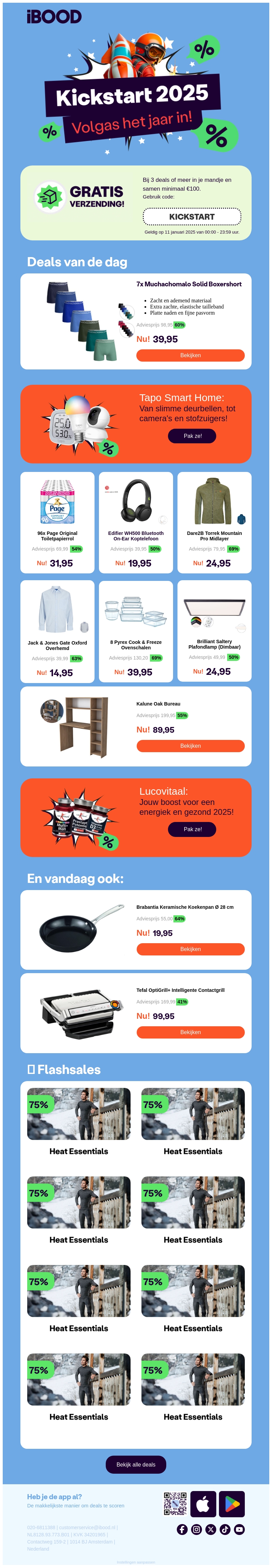 Start 2025 met geweldige deals en gratis verzending bij iBOOD. Ontdek aanbiedingen zoals de Muchachomalo Solid Boxershort set, Tapo Smart Home gadgets en meer. Mis de flashsales en kortingen niet, geldig tot middernacht. Gebruik de code om te profiteren van gratis verzending. Bereid je voor op een jaar vol besparingen.