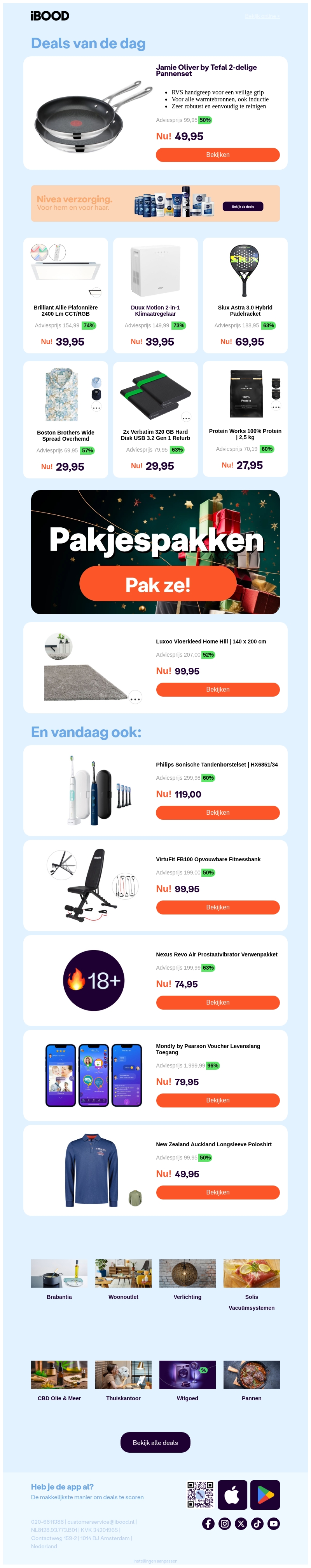 Ontdek onze nieuwste deals op topmerken zoals de Jamie Oliver Tefal pannenset voor het ultieme kookgemak. Vernieuw je garderobe met de elegante Boston Brothers overhemden en maak gebruik van betrouwbare opslag met Verbatim's harde schijven. Profiteer nu van deze en andere fantastische aanbiedingen.