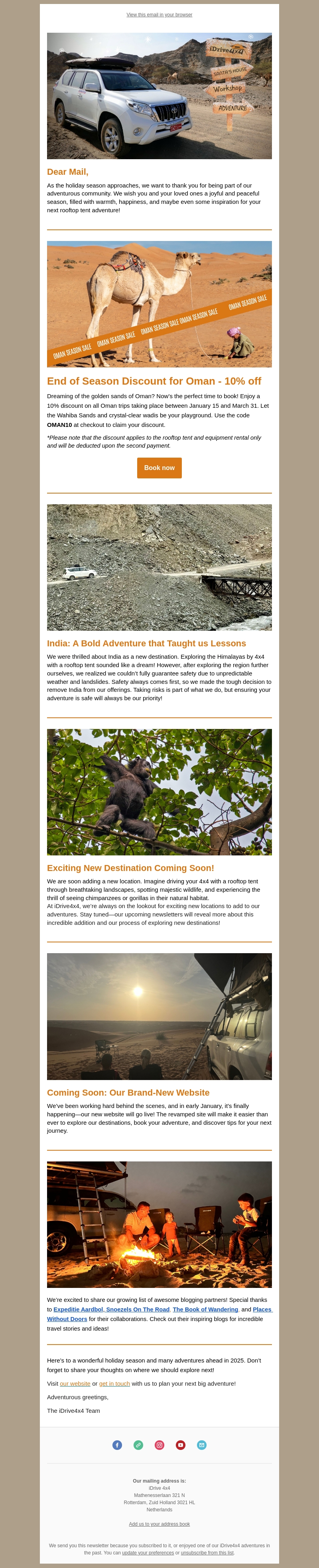 Deze nieuwsbrief brengt je het laatste nieuws van iDrive4x4. Profiteer van 10% korting op reizen naar Oman en ontdek een nieuwe exotische bestemming. Lees over onze avonturen in India en bereid je voor op onze geheel vernieuwde website, die binnenkort wordt gelanceerd. Geniet van de vakantieperiode met onze spannende aanbiedingen.
