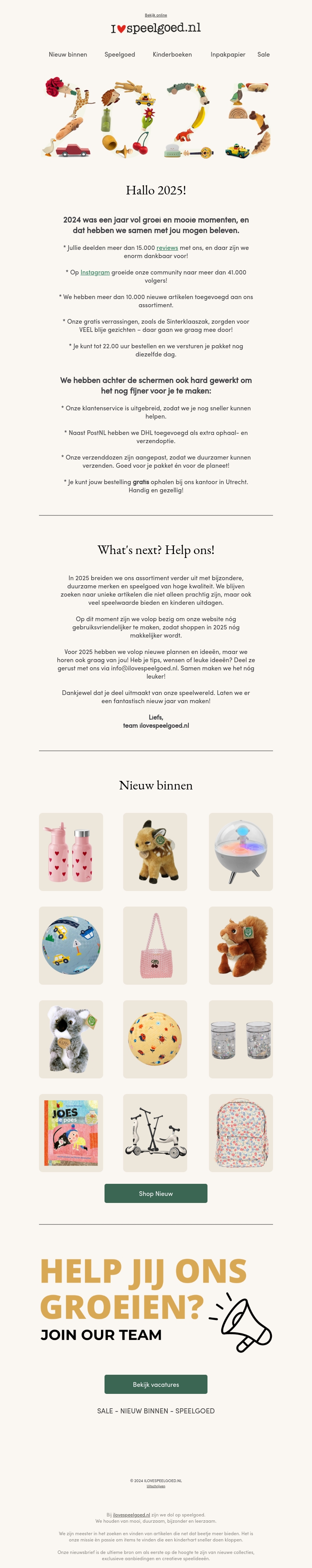 2024 was een succesvol jaar met veel hoogtepunten voor I Love Speelgoed. Met meer dan 15.000 tevreden reviews en een groeiende Instagram-community, kijken we uit naar 2025. Ontdek onze nieuwe producten en unieke cadeaus voor het nieuwe jaar. Onze bezorg- en verzendopties zijn verbeterd voor meer gemak en duurzaamheid. Doe mee aan onze groei met openstaande vacatures.
