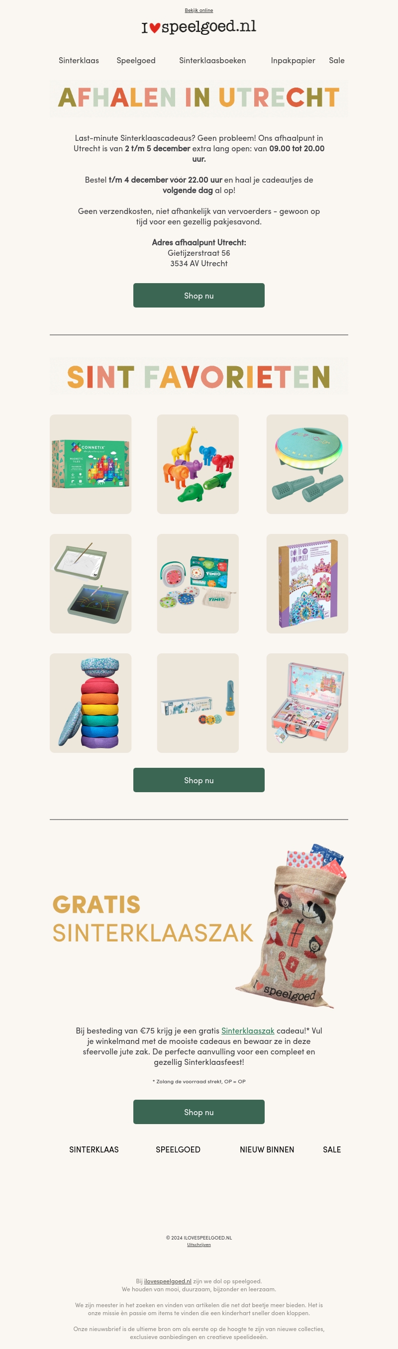Plan je bezoek aan Utrecht voor de perfecte Sinterklaascadeaus. Van 2 t/m 5 december hebben we uitgebreide openingstijden zodat je op tijd je presentjes kunt ophalen. Ontvang bij een aankoop van €75 een gratis Sinterklaaszak voor een compleet Sinterklaasfeest. Geen verzendkosten en direct ophalen in onze winkel.