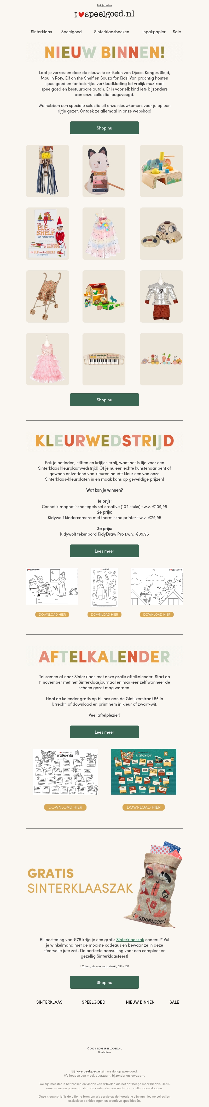 Verken de nieuwste collectie van Djeco, Konges Sløjd en meer. Ontdek prachtig houten speelgoed en inspirerend muzikaal speelgoed. Doe mee aan onze kleurwedstrijd en maak kans op geweldige prijzen. Tel af naar Sinterklaas met onze gratis aftelkalender. Profiteer van onze speciale Sinterklaasacties en ontvang een gratis Sinterklaaszak bij besteding van €75.
