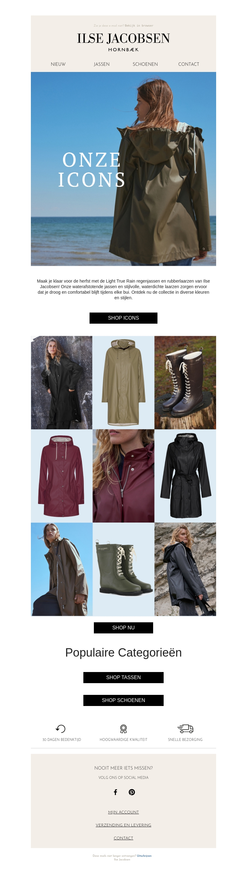 Maak je klaar voor de herfst met de waterdichte jassen en stijlvolle laarzen van Ilse Jacobsen. Onze collectie zorgt ervoor dat je droog en comfortabel blijft tijdens elke bui. Ontdek nu onze iconische regenjassen en rubberlaarzen.