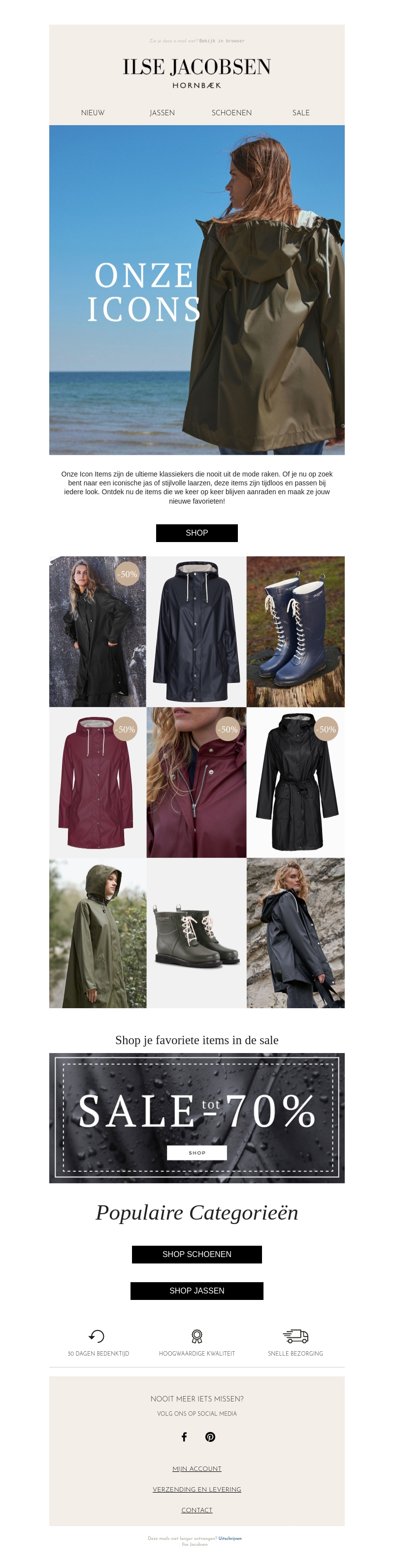 Ontdek de ultieme iconen van Ilse Jacobsen. Van stijlvolle jassen tot elegante laarzen, deze tijdloze items passen bij iedere look. Profiteer van kortingen tot 70% en vind je nieuwe favorieten.