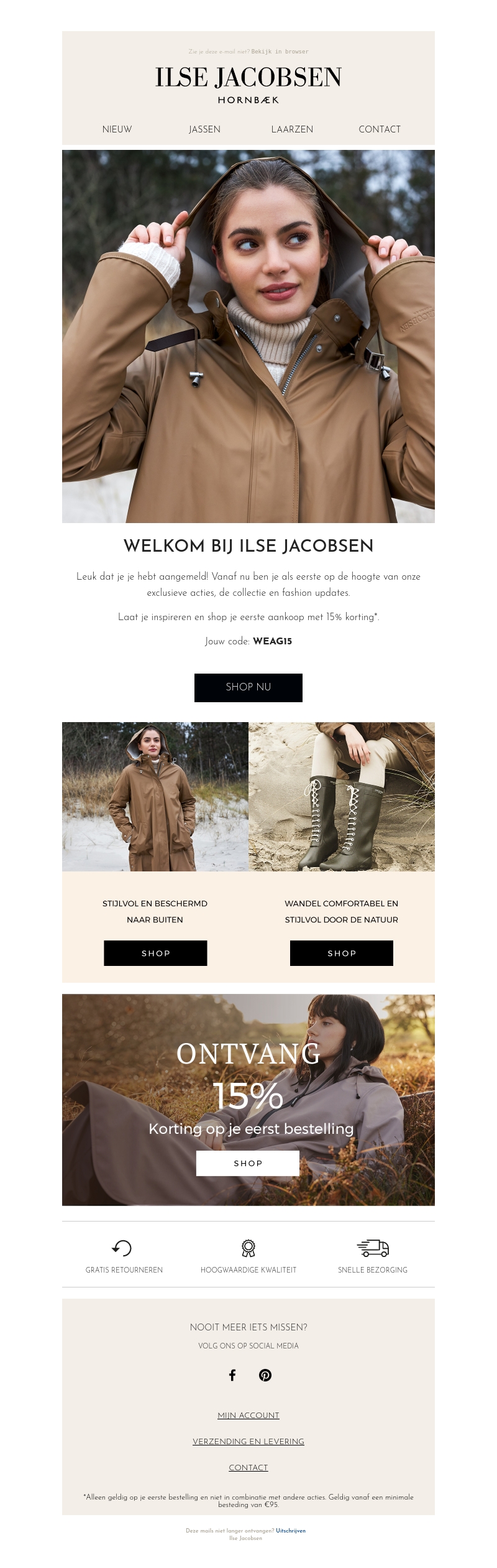 Leuk dat je je hebt aangemeld bij Ilse Jacobsen! Vanaf nu ben je als eerste op de hoogte van exclusieve acties, de nieuwste collectie en fashion updates. Ontvang 15% korting op je eerste aankoop met de code WEAG15. Shop nu de stijlvolle en functionele jassen en laarzen.