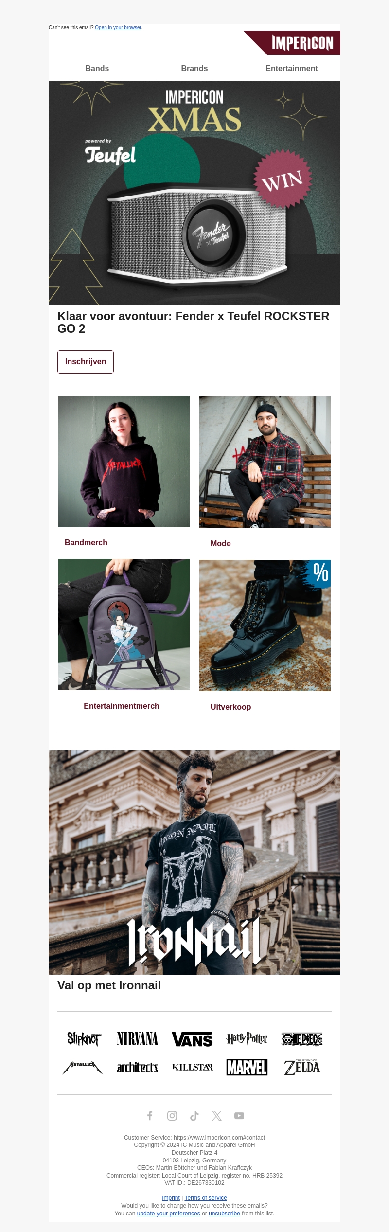 Impericon presenteert een unieke kans om de Fender x Teufel ROCKSTER GO 2 te winnen. Deze krachtige speaker, perfect voor avonturiers en muziekliefhebbers, tilt je muziekervaring naar een hoger niveau. Daarnaast biedt Impericon modieuze bandmerchandise, mode, entertainmentartikelen en uitverkoop-aanbiedingen. Zorg dat je je inschrijft voor deze spectaculaire actie en meer ontdekt. Profiteer van exclusieve deals deze feestdagen!