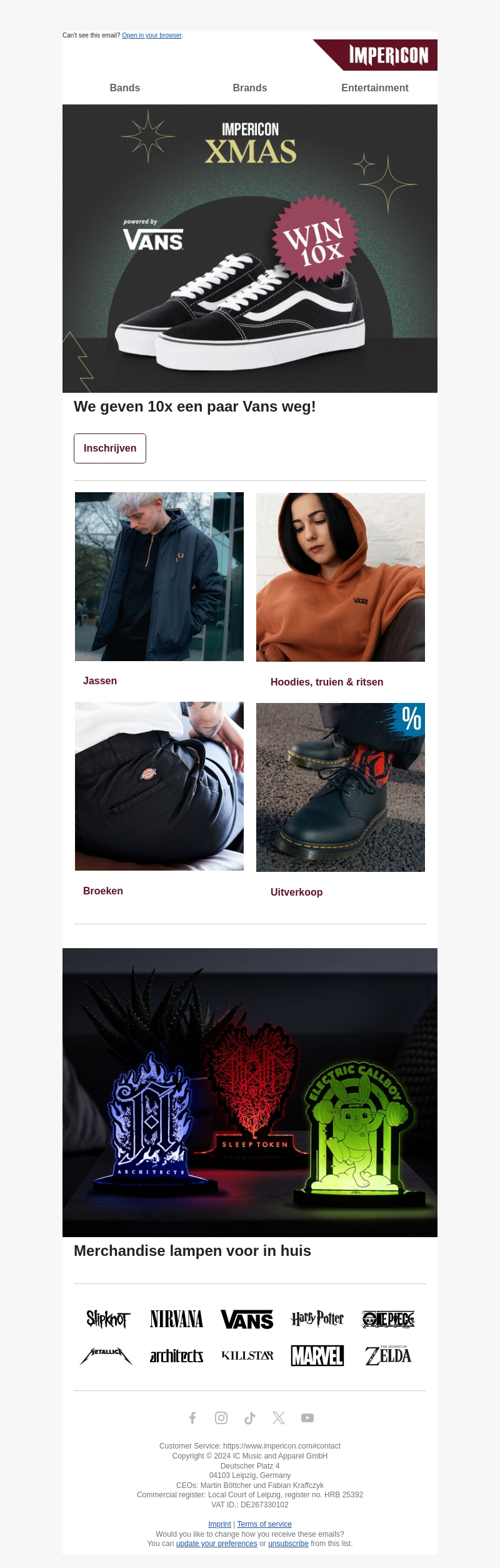 Beleef de feestdagen met een unieke kans om een paar Vans te winnen. Impericon XMAS geeft jou de mogelijkheid om je schoenenverzameling een boost te geven. Doe mee en maak kans op één van de 10 te winnen paar Vans! Daarnaast vind je in de nieuwsbrief stijlvolle jassen, hoodies en meer. Doe mee, voordat de kans voorbij is.