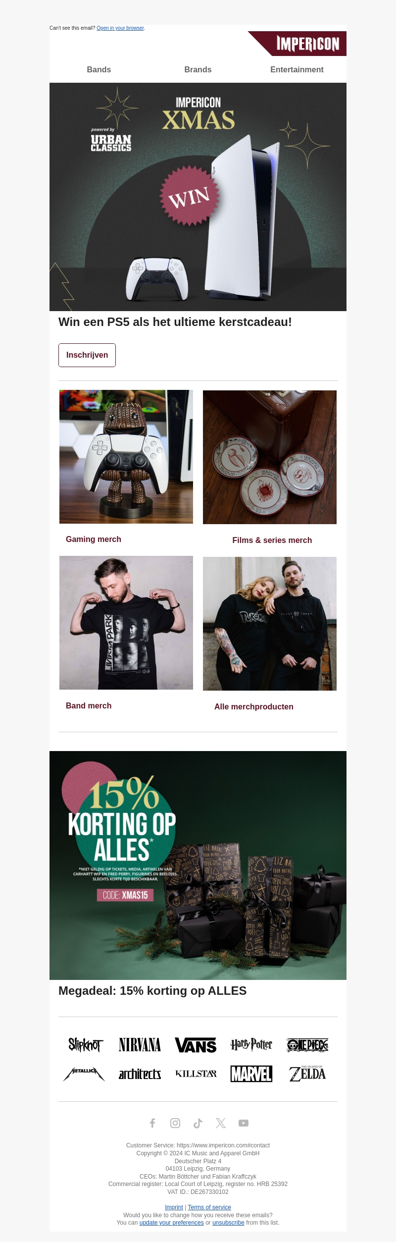 Impericon organiseert een spannende kerstactie waarbij je een PlayStation 5 kunt winnen. Neem deel aan de actie en maak kans op dit ultieme kerstcadeau. Ook biedt Impericon een speciale korting van 15% op alle merchproducten. Ontdek het aanbod van gaming, films, series en bands. Grijp deze kans om je favoriete merchandise met korting aan te schaffen.