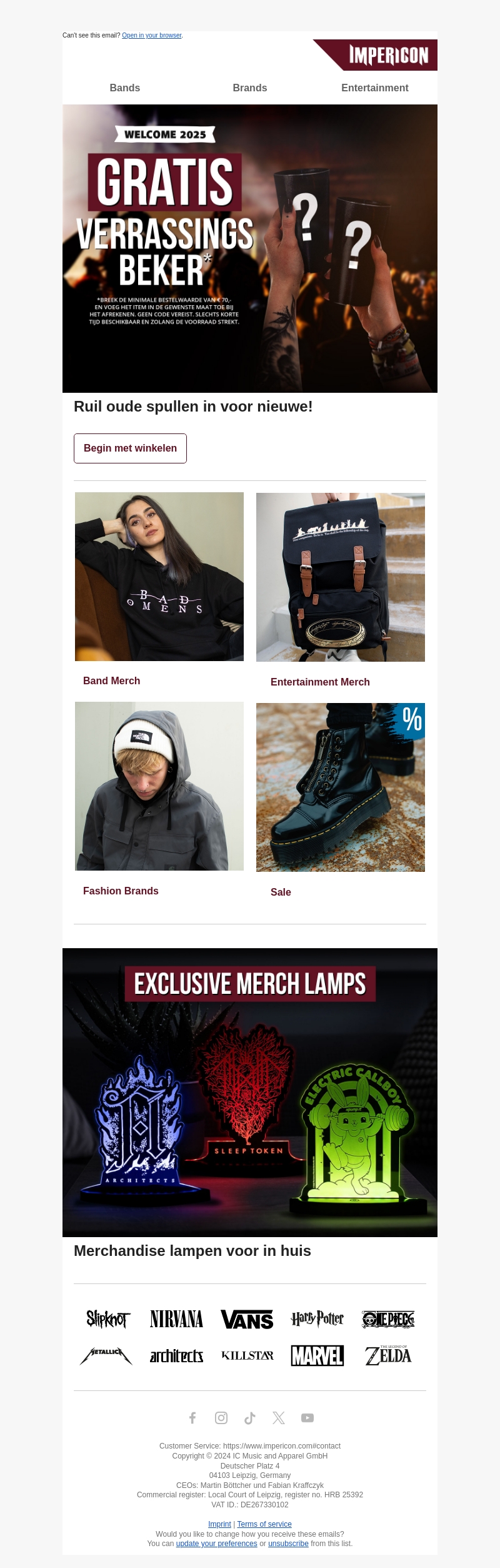Begin het jaar 2025 goed met een gratis verrassingsbeker bij je aankoop van β¬70 of meer. Ontdek ons assortiment aan band en entertainment merchandise. Ruil oude spullen voor nieuwe en geniet van exclusieve merch lampen. Bezoek nu onze winkel en profiteer van deze tijdelijke aanbieding. Geen kortingscode nodig, slechts beperkt beschikbaar!