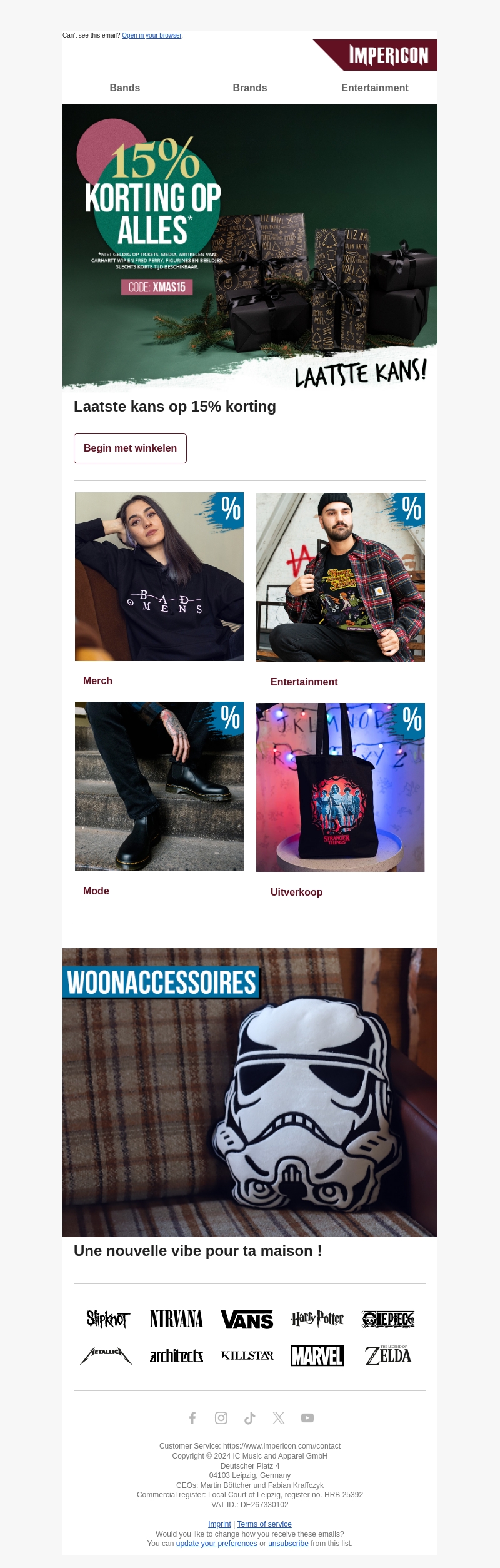 Profiteer nu van een geweldige korting van 15% op alles bij Impericon. Van muziek-merchandise tot stijlvolle woonaccessoires, er is voor ieder wat wils. Mis deze kans niet, want de actie is slechts tijdelijk beschikbaar. Gebruik de kortingscode XMAS15 bij het afrekenen. Begin met winkelen en verfris je garderobe en huis. Doe mee en geniet van deze unieke aanbieding.
