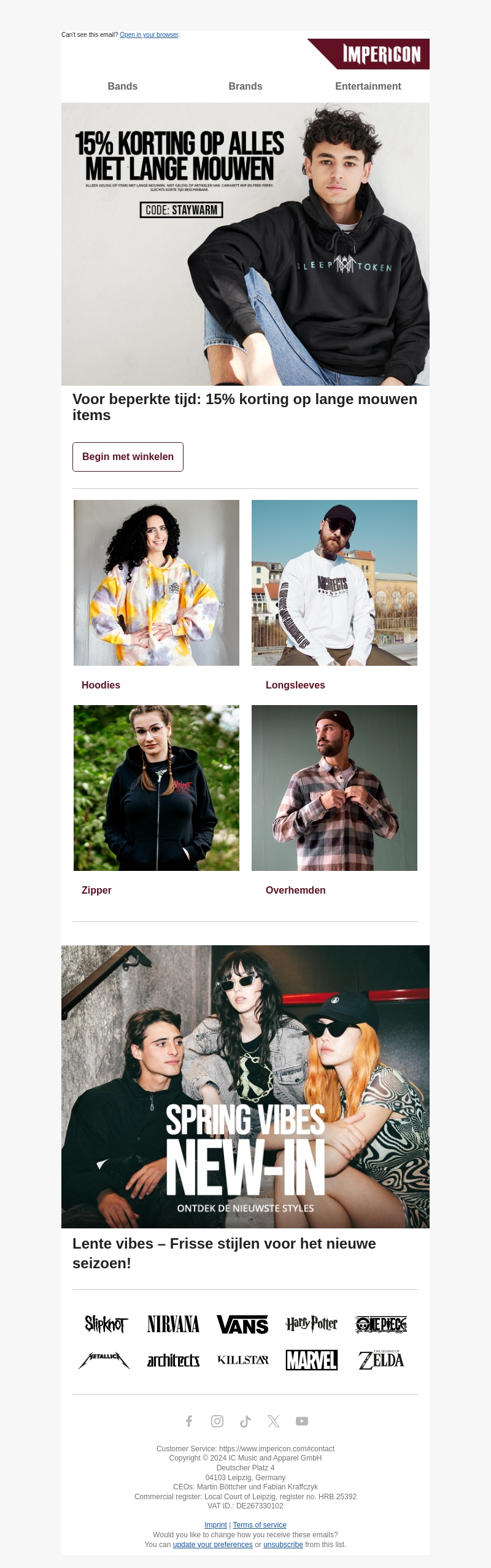 Ontdek een geweldige korting van 15% op alle lange mouwen items bij Impericon. Of je nu op zoek bent naar hoodies, longsleeves, zippers of overhemden, er is voor ieder wat wils. Deze aanbieding is geldig voor een beperkte tijd, dus mis deze kans niet om je stijlen bij te werken. Perfect voor een frisse lente-look. Begin met winkelen en bespaar nu!