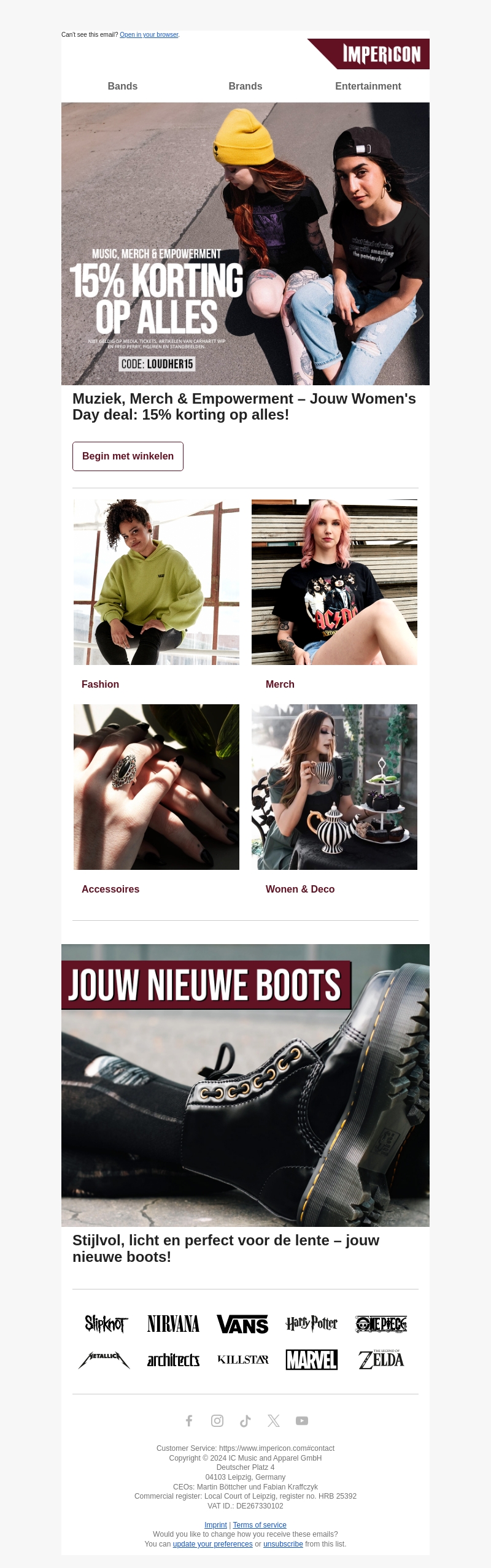 Ontvang 15% korting op je favoriete items bij Impericon! Of je nu op zoek bent naar muziek, mode of stijlvolle accessoires, er is voor ieder wat wils. Mis deze kans niet om je garderobe aan te vullen met trendy merchandise. Ga snel naar onze website en ontdek de diverse collecties. Shop vandaag nog en geniet van unieke aanbiedingen. De code is slechts tijdelijk beschikbaar, dus wees er snel bij!