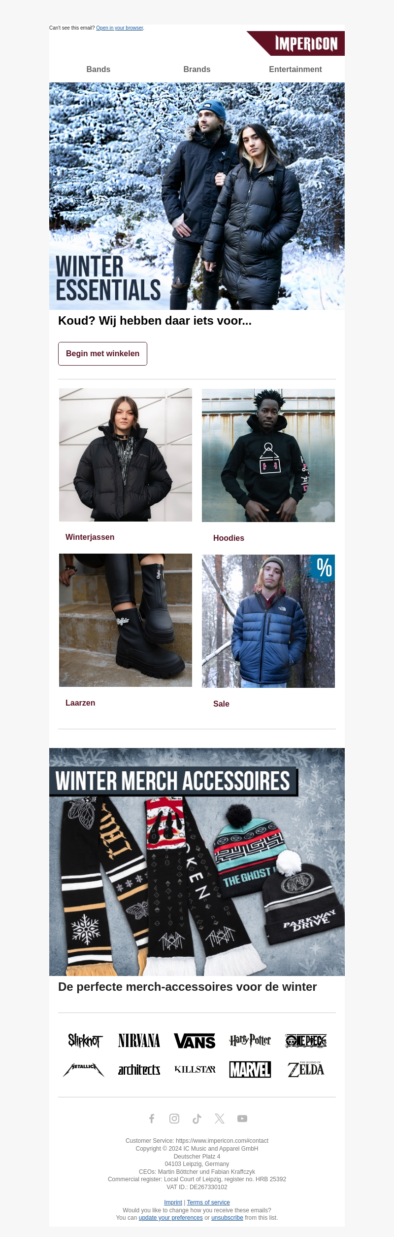 Bereid je voor op de koude dagen met de winteressentials van Impericon. Van stijlvolle jassen en warme hoodies tot stevige laarzen en unieke merchandise accessoires, er is voor ieder wat wils. Mis de kans niet om je wintergarderobe aan te vullen en profiteer van onze uitverkoop. Blijf warm en stijlvol, ontdek nu onze collectie.