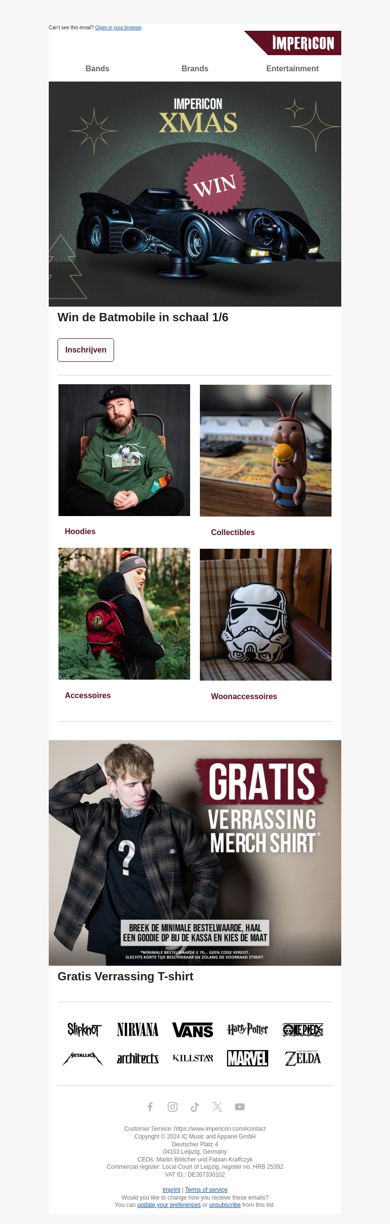 Impericon biedt je de kans om een exclusieve Batmobile verzamelfiguur te winnen! Mis deze kerstactie niet en ontdek de diverse collecties van Impericon, van hoodies tot woonaccessoires. Bovendien krijg je een gratis verrassings-T-shirt bij je bestelling. Schrijf je snel in om mee te doen!