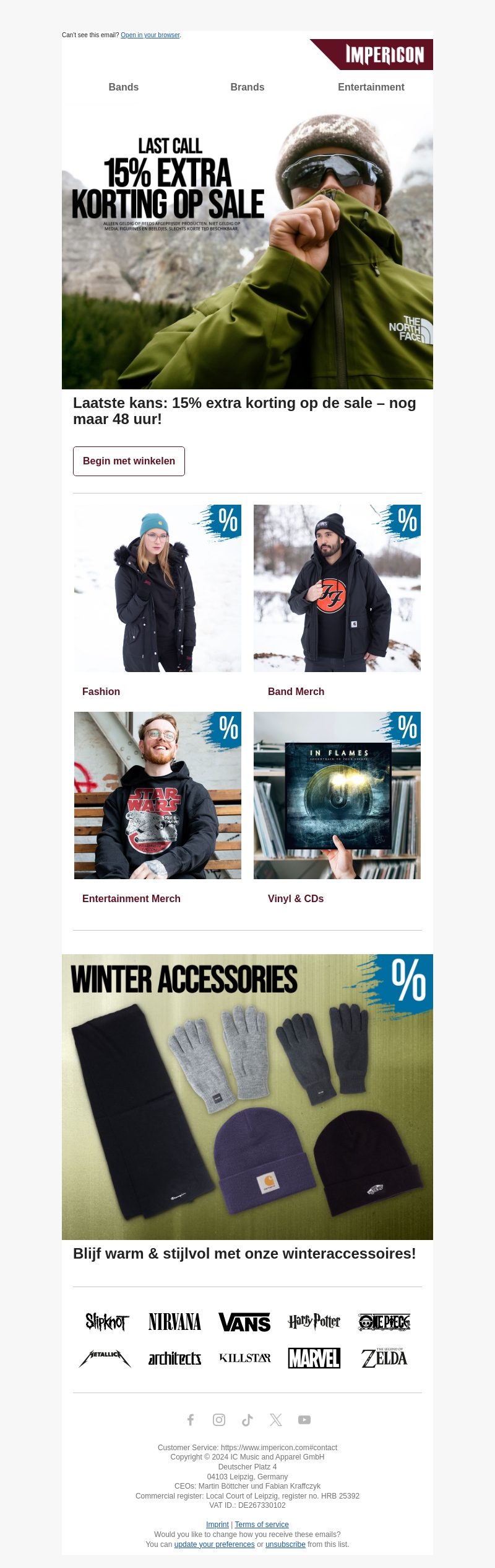 Mis deze kans niet om 15% extra korting te krijgen op onze al verlaagde producten! Of je nu op zoek bent naar modieuze winteraccessoires of merchandise van je favoriete bands, we hebben iets voor iedereen. Bezoek vandaag nog onze website en geniet van deze beperkte aanbieding. Vergeet niet, de deal stopt over 48 uur, dus wees er snel bij. Dit is het moment om je garderobe aan te vullen met nieuwe stijlen. Start je winkelervaring nu!