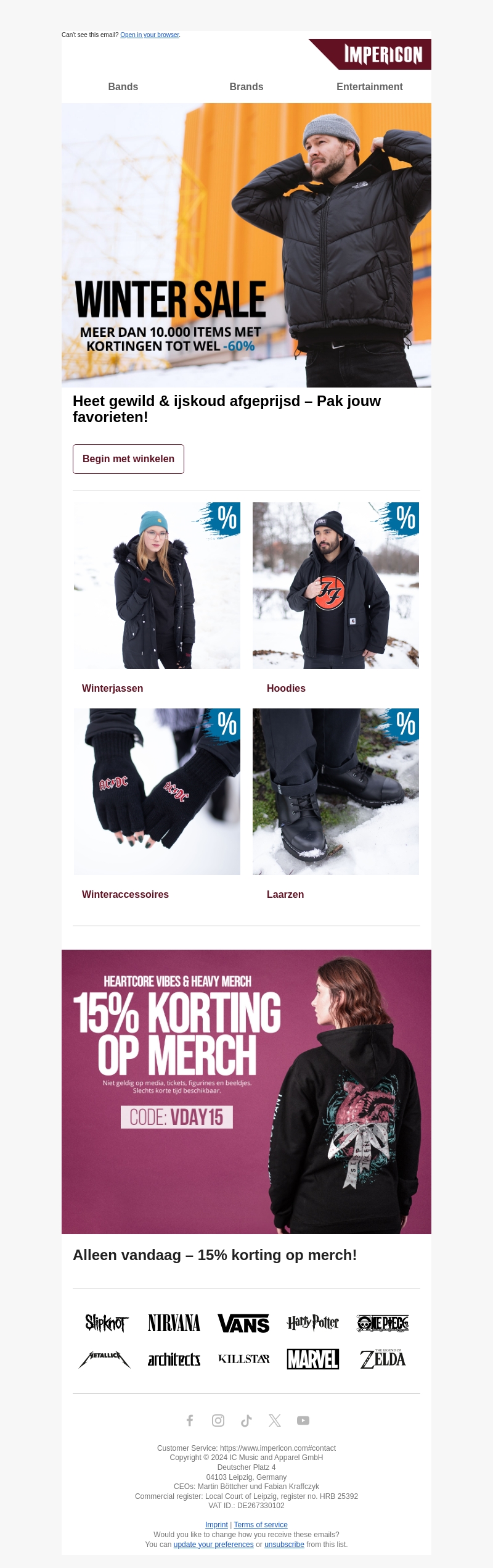 Duik in de Winter Sale bij Impericon en ontdek meer dan 10.000 artikelen met kortingen tot wel 60%! Van warme winterjassen en stijlvolle hoodies tot must-have winteraccessoires en robuuste laarzen, er is voor elk wat wils. Bovendien krijg je vandaag 15% extra korting op geselecteerde merchandise met de kortingscode. Mis deze kans niet om je wintercollectie aan te vullen.
