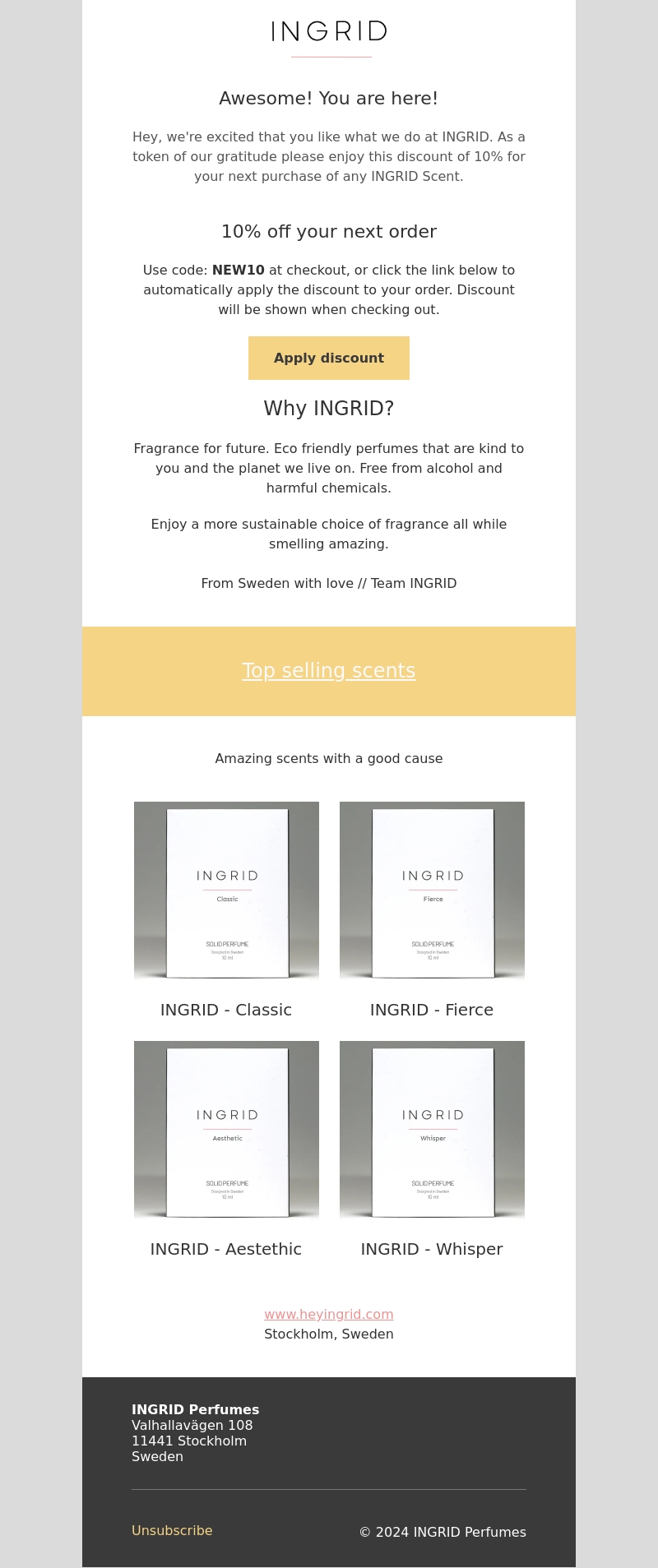 We zijn blij dat je van onze producten houdt! Gebruik deze kortingscode om 10% korting te krijgen op je volgende aankoop bij INGRID. Ontdek onze eco-vriendelijke geuren en support een duurzamere toekomst. Bekijk onze best verkochte geuren en shop nu met korting!