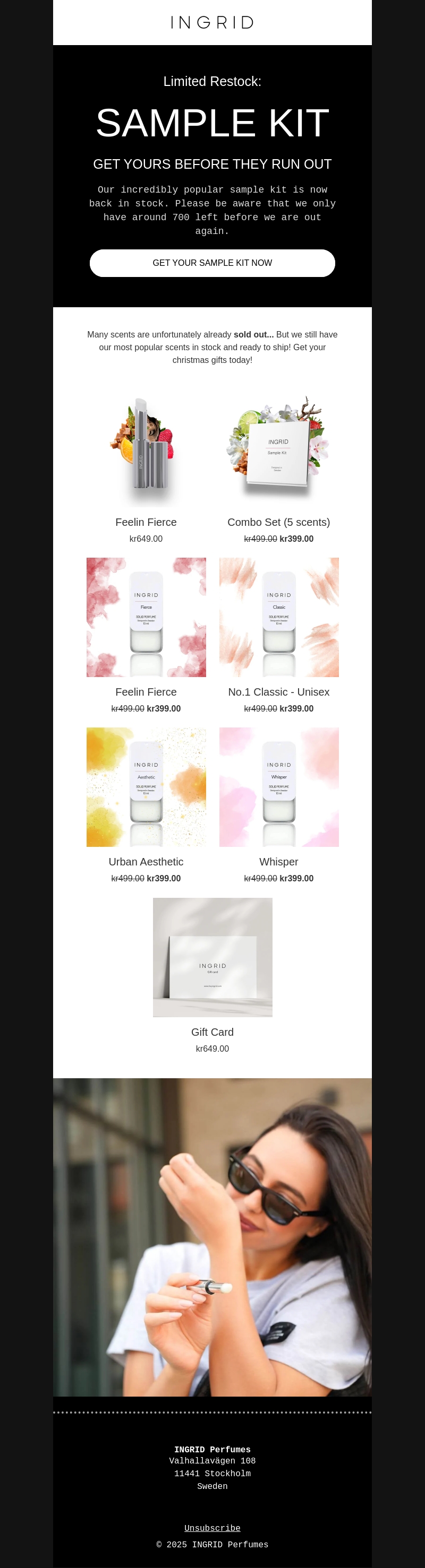 De enorm geliefde sample kits van Ingrid zijn weer op voorraad! Wees er snel bij, want er zijn nog maar 700 beschikbaar. Deze set bevat een geweldige selectie van onze bestverkochte geuren. Ideaal als cadeau of om jezelf te verwennen. Klik snel om jouw set te bestellen en mis deze kans niet.