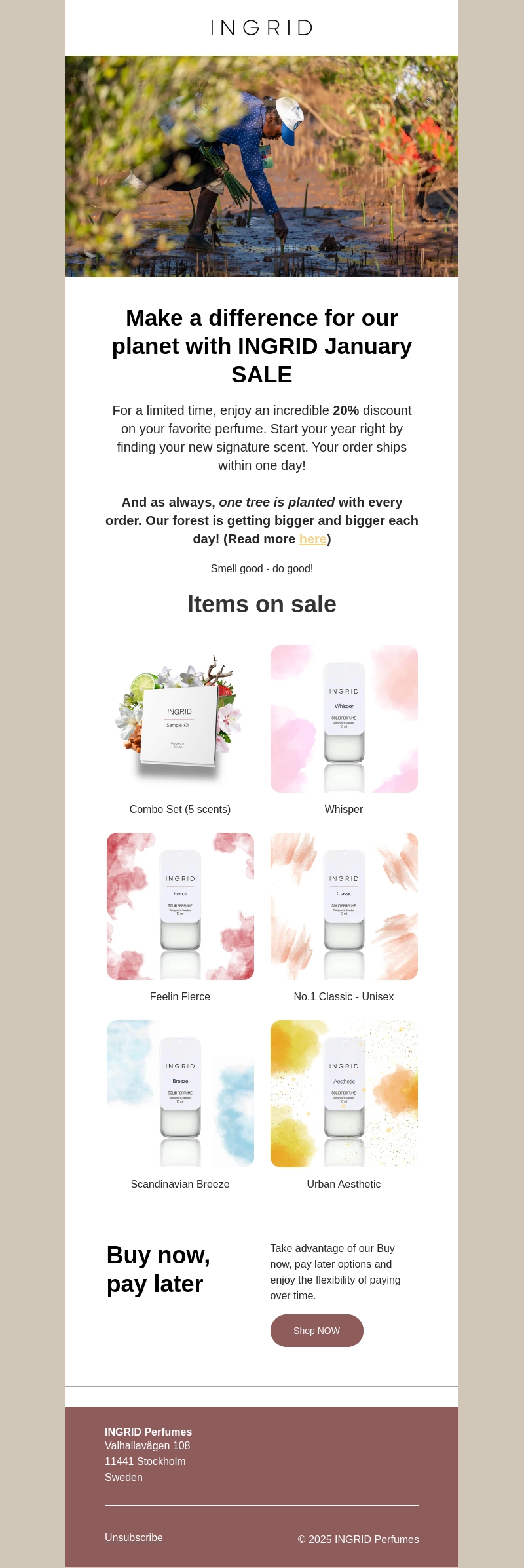 Ontdek de onweerstaanbare INGRID parfums met een exclusieve korting van 20%. Begin het jaar met een nieuwe geur en geniet van snelle levering binnen één dag. Bovendien, met elke aankoop wordt er een boom geplant. Mis deze kans niet om goed te doen!
