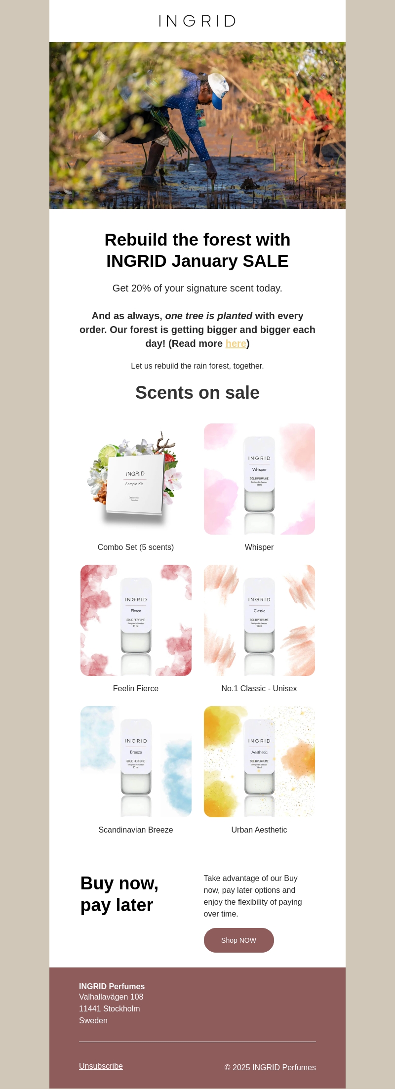 Profiteer van 20% korting op je favoriete geur en steun de herbebossing. Voor elke aankoop planten we een boom, waarmee we onze aarde groener maken. Ontdek onze geuren in de uitverkoop en koop nu, betaal later. Samen kunnen we het regenwoud herstellen.