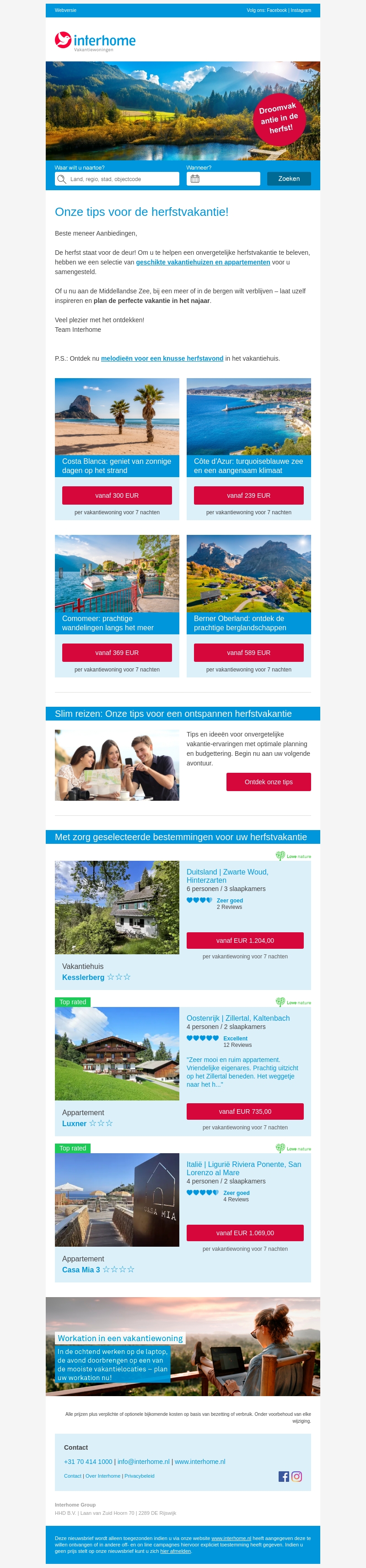 De herfst staat voor de deur en met Interhome bent u verzekerd van een onvergetelijke vakantie. Verken zonnige stranden, turkooizen zeeΓ«n en prachtige berglandschappen. Ontdek onze zorgvuldig geselecteerde accommodaties in Duitsland, Oostenrijk en ItaliΓ« voor een ontspannen herfstvakantie.