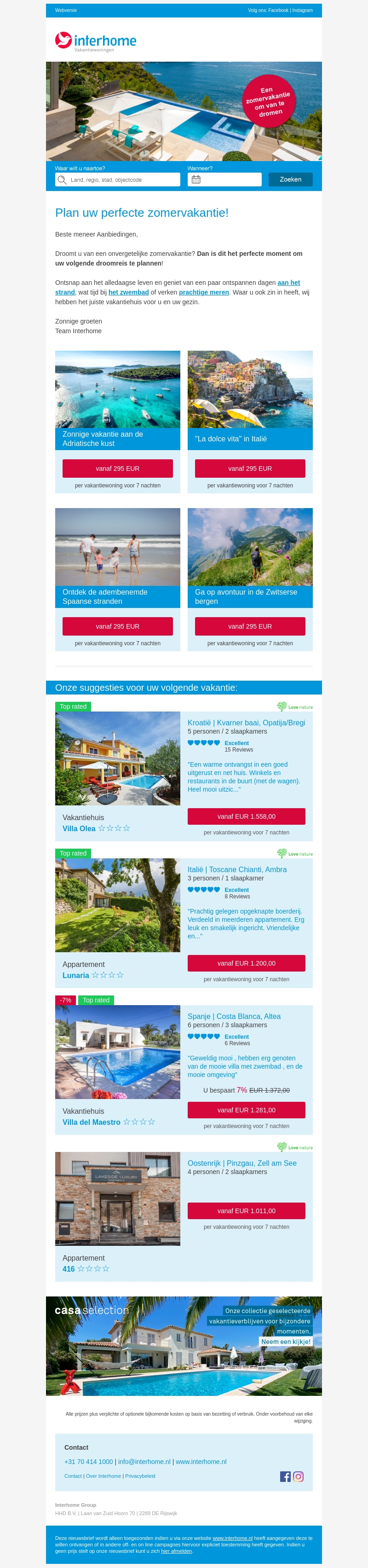 Droomt u van een onvergetelijke zomervakantie? Ontsnap aan het alledaagse en geniet van zonnige zeeΓ«n, prachtige bergen en gezellige vakantiehuizen. Ontdek de Adriatische kust, Italiaanse schoonheid, Spaanse stranden en de Zwitserse bergen. Boek nu vanaf β¬295 voor 7 nachten.