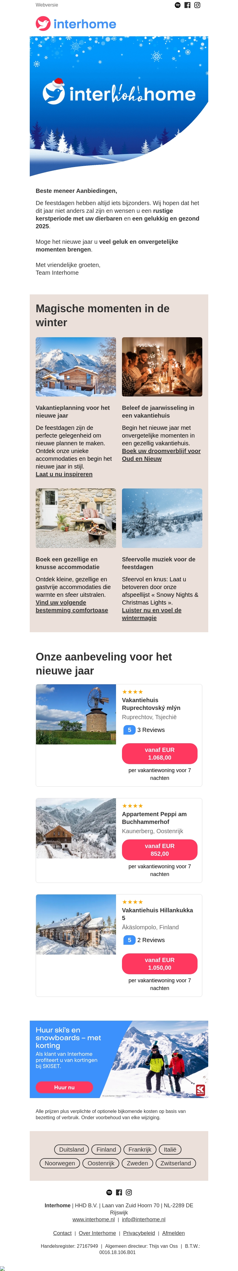 Geniet van een warme kerst met Interhome, vol magische momenten en unieke vakanties. Begin het nieuwe jaar in stijl met onze exclusieve accommodaties. Boek nu uw droomverblijf en beleef onvergetelijke avonturen. Ontdek onze speciale kerstdeals en laat u inspireren door sfeervolle muziek voor de feestdagen.