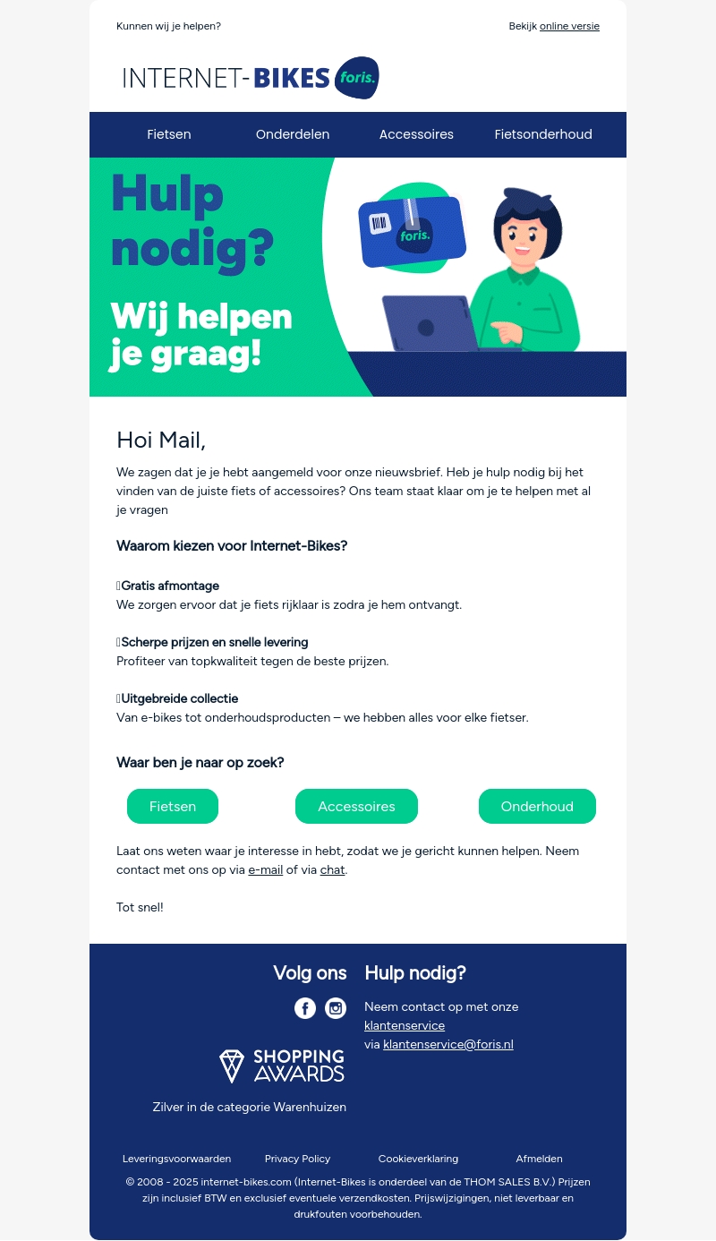 Heb je hulp nodig bij het kiezen van de juiste fiets of accessoires? Ons team staat klaar om je te assisteren. Internet-Bikes biedt gratis montage bij ontvangst, scherpe prijzen, en een uitgebreide collectie, van e-bikes tot onderhoudsproducten. Neem contact op via e-mail of chat voor ondersteuning.