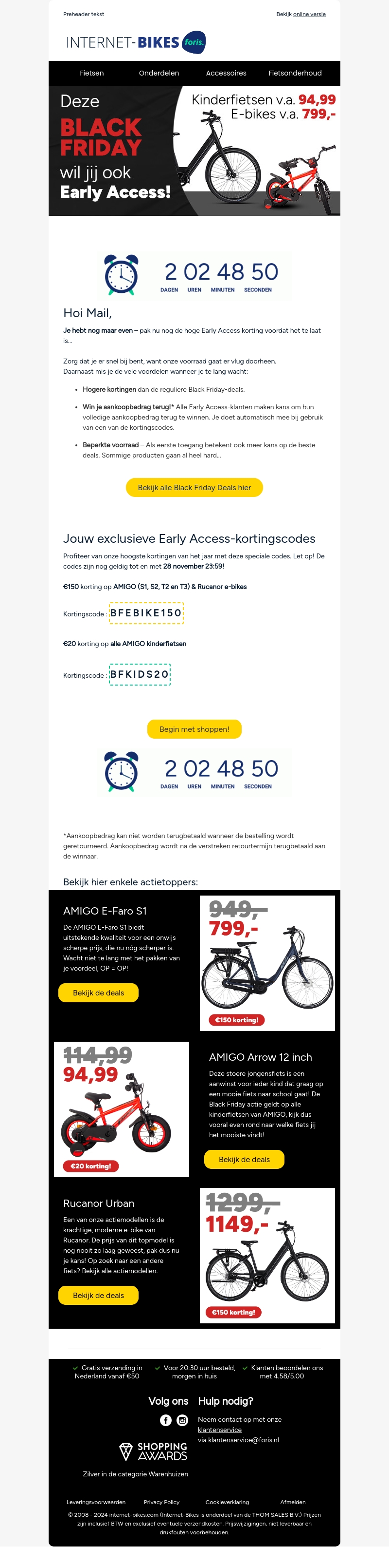 Pak nu je kans op extra hoge kortingen tijdens de Black Friday Early Access bij Internet-Bikes. Geniet van scherpe prijzen op kinderfietsen vanaf €94,99 en e-bikes vanaf €799,-. Wees er snel bij want de voorraad is beperkt. Gebruik je speciale kortingscode voor nog meer voordeel. Mis deze unieke kans om groot te besparen niet!