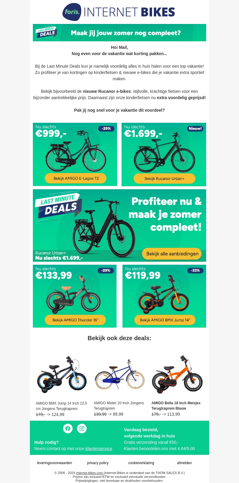 Hoi Mail, nog even voor de vakantie wat korting pakken? Bij de Last Minute Deals kun je voordelig alles in huis halen voor een top vakantie! Profiteer van kortingen op kinderfietsen en nieuwe e-bikes. Pak jij nog snel voor je vakantie dit voordeel?