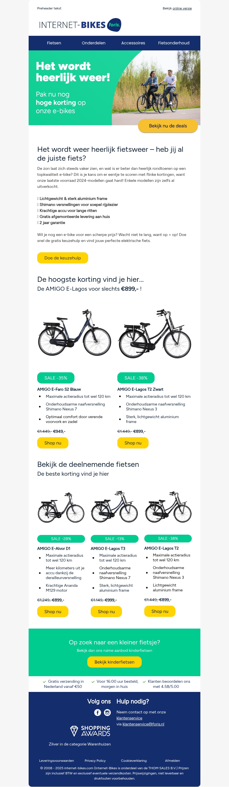 Het is heerlijk fietsweer en bij Internet-Bikes krijg je nu hoge kortingen op diverse e-bikes! Profiteer van onze topdeals met kortingen tot wel 38%. Bekijk ons ruime aanbod en vind jouw perfecte fiets. Gratis verzending en snelle levering gegarandeerd!