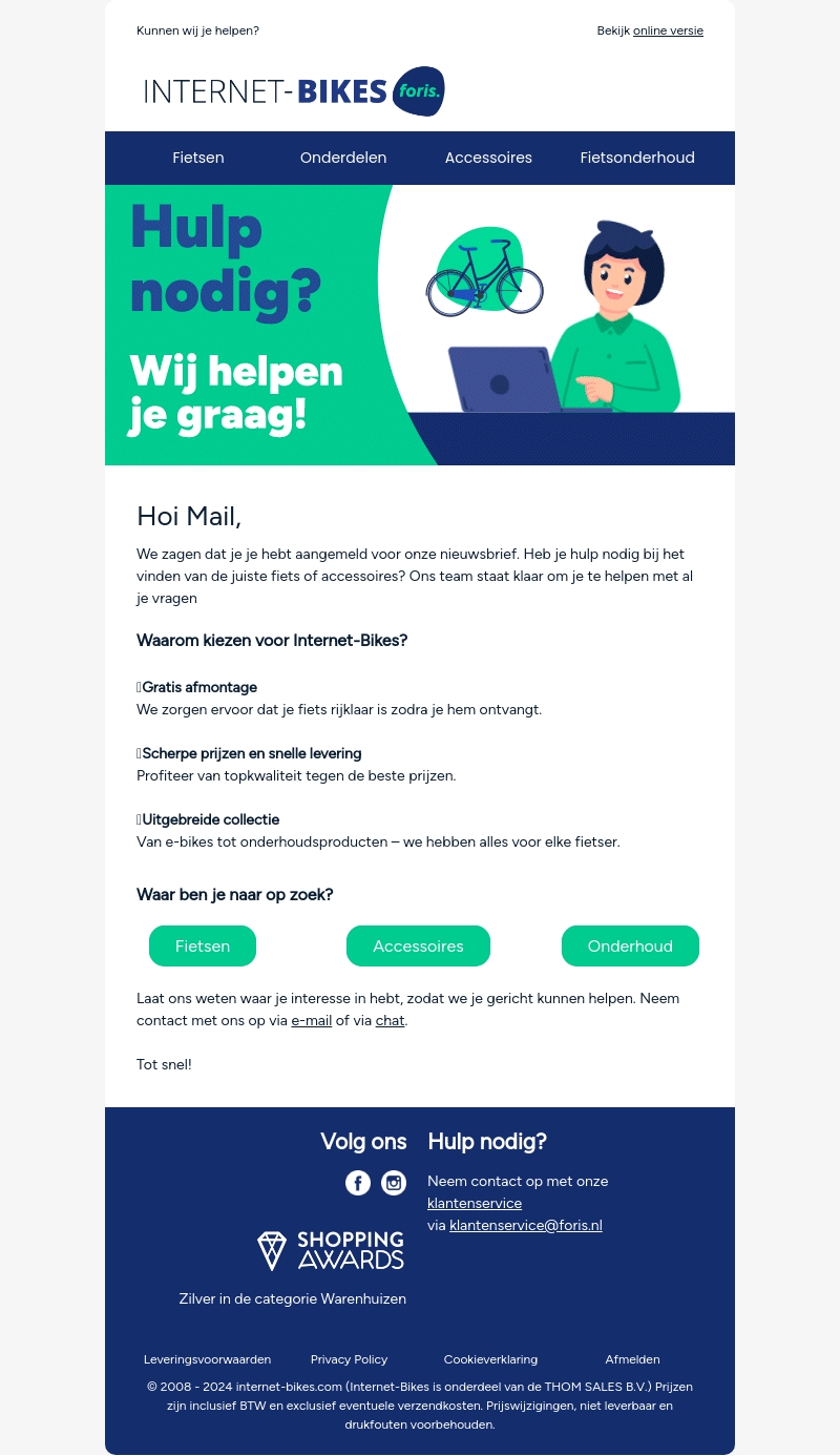 Internet-Bikes helpt je bij het vinden van de perfecte fiets en accessoires. Met gratis afmontage en scherpe prijzen, ontvang je jouw fiets helemaal rijklaar. Profiteer van een uitgebreide collectie, van e-bikes tot onderhoudsproducten. Neem contact op voor persoonlijke hulp bij jouw keuze.
