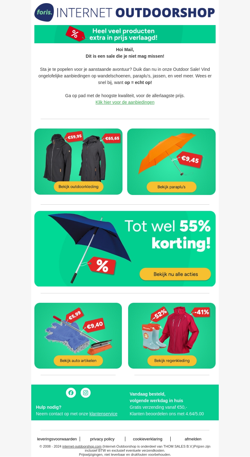 Hoi Mail, dit is een sale die je niet mag missen! Ontdek onweerstaanbare deals op wandelschoenen, paraplu's, jassen en meer. Wees er snel bij want op = op. Ga op pad met de hoogste kwaliteit voor de allerlaagste prijzen.