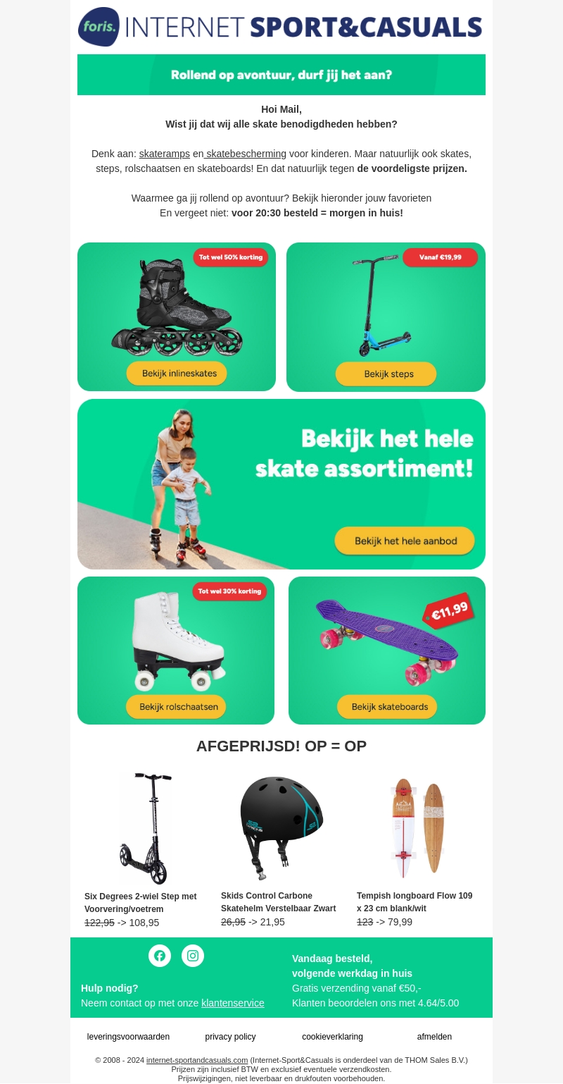 Wist je dat we alle skate benodigdheden hebben? Denk aan skateramps, skatebescherming, skates, steps, rolschaatsen en skateboards. En dat natuurlijk tegen de voordeligste prijzen! Ontdek jouw favorieten en vergeet niet: voor 20:30 besteld = morgen in huis!