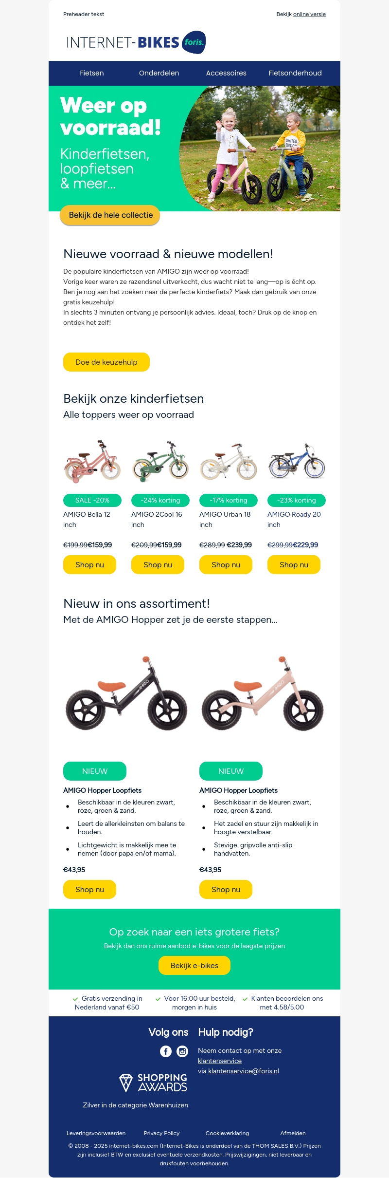 Ben je op zoek naar een nieuwe kinderfiets? Internet-Bikes heeft goed nieuws! De populaire kinderfietsen van AMIGO zijn weer op voorraad. Ontdek de nieuwste modellen en maak gebruik van onze handige keuzehulp. Kies uit verschillende stijlen en maten die perfect passen bij de kleine avonturier in jouw leven.