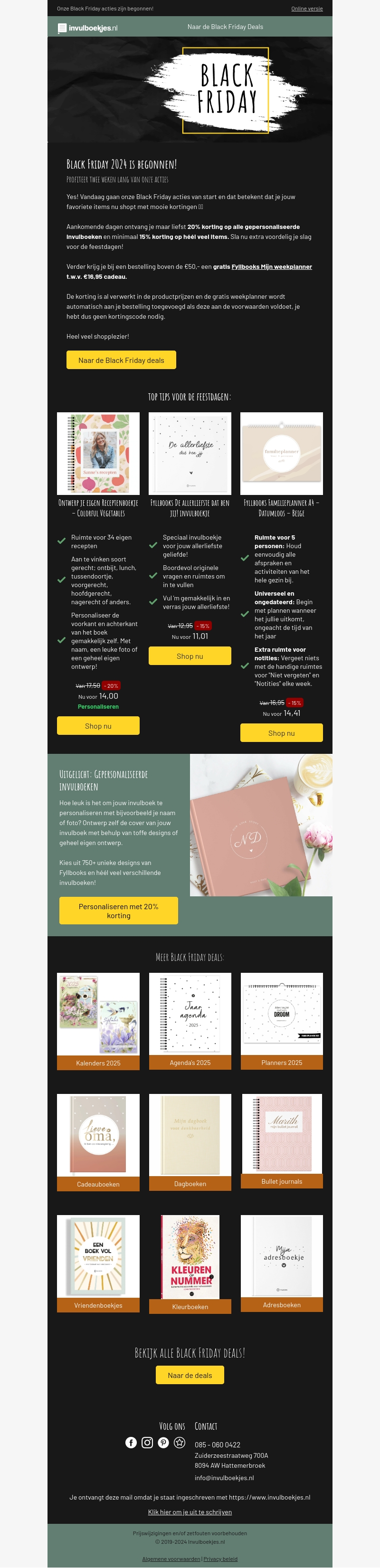 De Black Friday Sale 2023 is begonnen bij invulboekjes.nl. Geniet van 20% korting op alle gepersonaliseerde invulboeken. Bovendien ontvang je deze week een gratis Fyllbooks Mijn Weekplanner bij bestellingen boven de €50. Bekijk onze top tips voor de feestdagen en mis de kans niet om unieke designs te personaliseren.