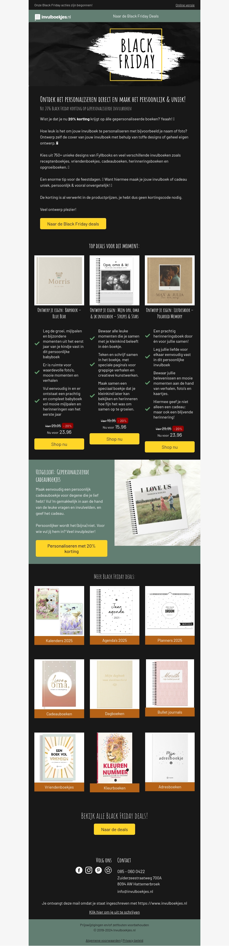 Ontdek de Black Friday Sale met 20% korting op gepersonaliseerde invulboekjes. CreΓ«er iets unieks en persoonlijks met honderden designs. Ideaal voor speciale momenten en als cadeau. Onze hoogwaardige en creatieve invulboekjes zorgen voor een blijvende herinnering. Wacht niet langer en profiteer van deze speciale aanbieding!