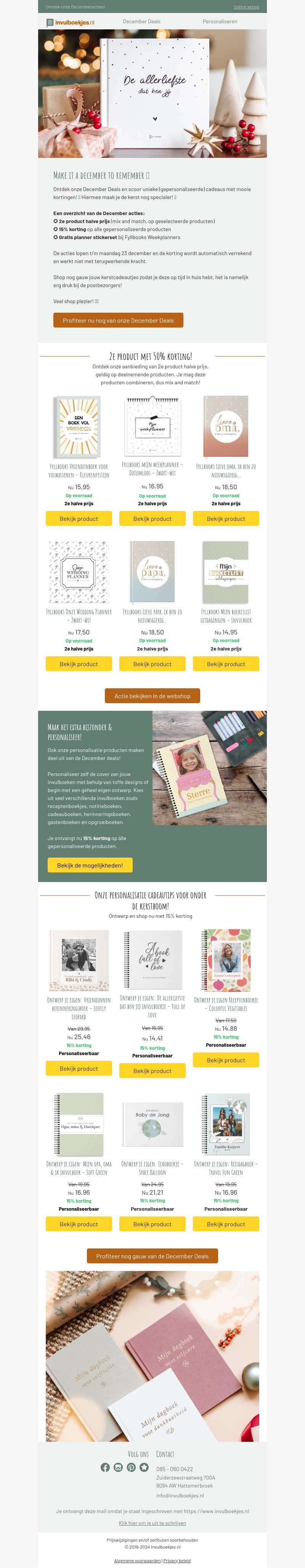 Verlies jezelf in de magie van december bij Invulboekjes.nl. Profiteer van exclusieve aanbiedingen, inclusief 2e product voor halve prijs en 15% korting op gepersonaliseerde invulboeken. Ontwerp het perfecte cadeau voor de kerst en maak herinneringen onvergetelijk!