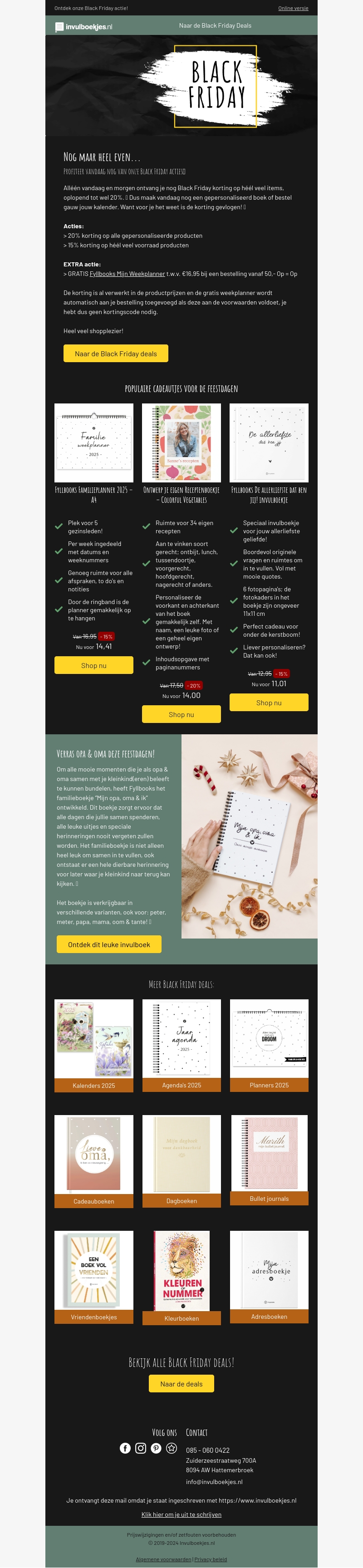 Mis de kans niet om te profiteren van de geweldige Black Friday aanbiedingen. Ontvang een gratis Suikeloze Mini WeegKanjerset bij bestelling. Nog maar heel even beschikbaar, dus zorg dat je je favoriete invulboekjes vandaag nog koopt. Perfect voor cadeau-ideeΓ«n en om je feestdagen te plannen.