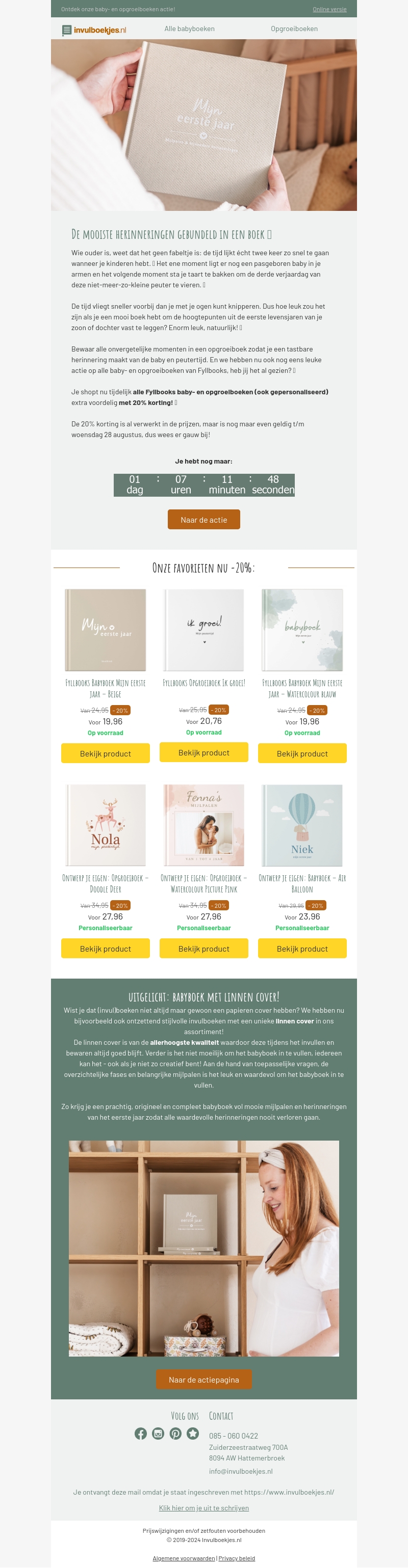 Profiteer nu van 20% korting op Fyllbooks baby- en opgroeiboeken. Deze aanbieding is geldig tot woensdag 28 augustus. Kies uit onze favorieten en bewaar de mooiste herinneringen in een prachtig boek. De korting is al verwerkt in de prijzen, wacht niet te lang!