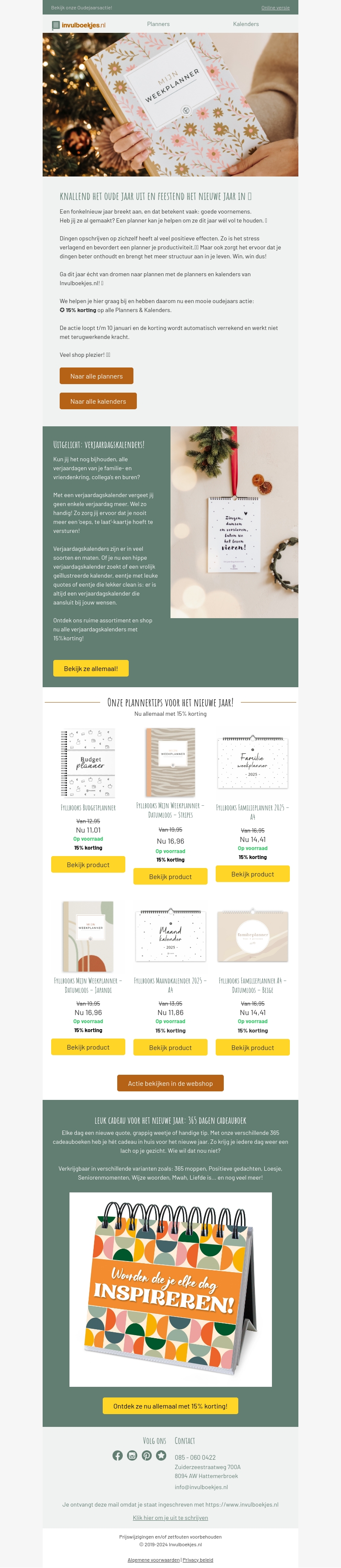 Bereid je voor op het nieuwe jaar met fantastische aanbiedingen op planners en kalenders. Geniet van 15% korting terwijl de voorraad strekt. Perfect om georganiseerd te blijven en het jaar goed te beginnen. Mis deze oudejaarsactie niet en shop nu bij Invulboekjes.nl.