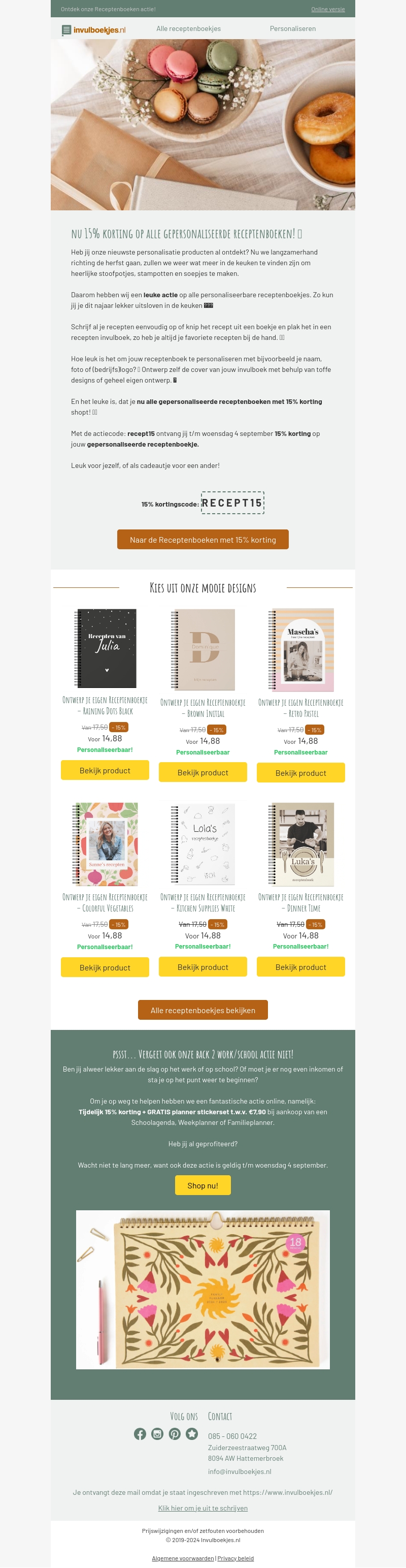Ontdek onze nieuwste gepersonaliseerde receptenboeken en geniet van 15% korting! Personaliseer jouw eigen receptenboek en bewaar al je favoriete recepten op รฉรฉn plek. Gebruik de code RECEPT15 voor korting. Deze aanbieding is geldig tot en met woensdag 4 september.