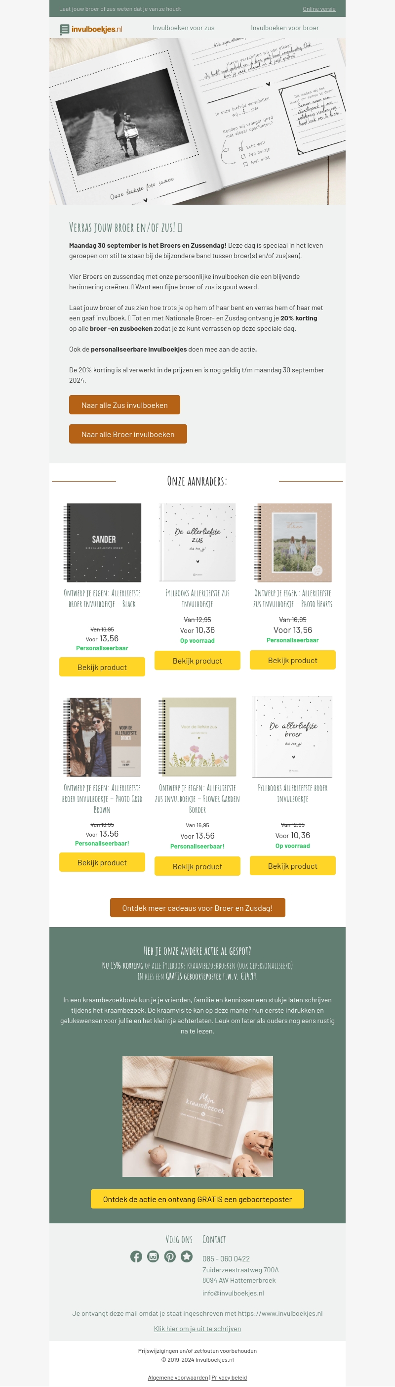 Maandag 30 september is het Broers en Zussendag! Om deze bijzondere band te vieren, bieden wij persoonlijke invulboeken aan voor broers en zussen. Deze boeken zijn een blijvende herinnering en maken een geweldig cadeau. Profiteer nu van 20% korting op alle broer- en zusinvoegboeken. Actie geldig tot 30 september 2024. Ontdek meer over onze aanbiedingen!