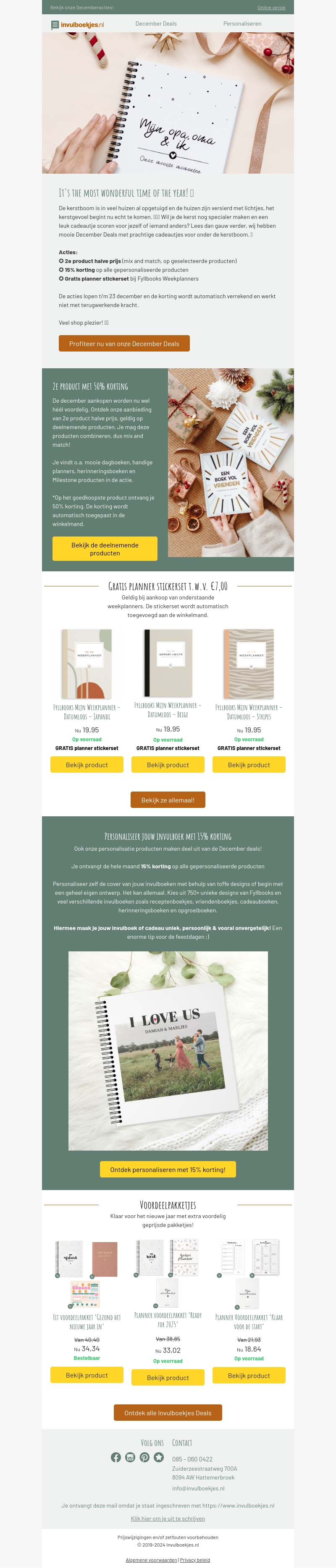 Met de feestdagen in aantocht is het tijd om na te denken over het perfecte kerstcadeau. In deze nieuwsbrief ontdek je geweldige kortingen, met tot 50% korting op het tweede product en 15% korting op alle gepersonaliseerde producten. Haal een gratis sticker set bij elke planner aankoop en geniet van de speciale december deals. Maak deze kerst onvergetelijk met onze unieke cadeaus!
