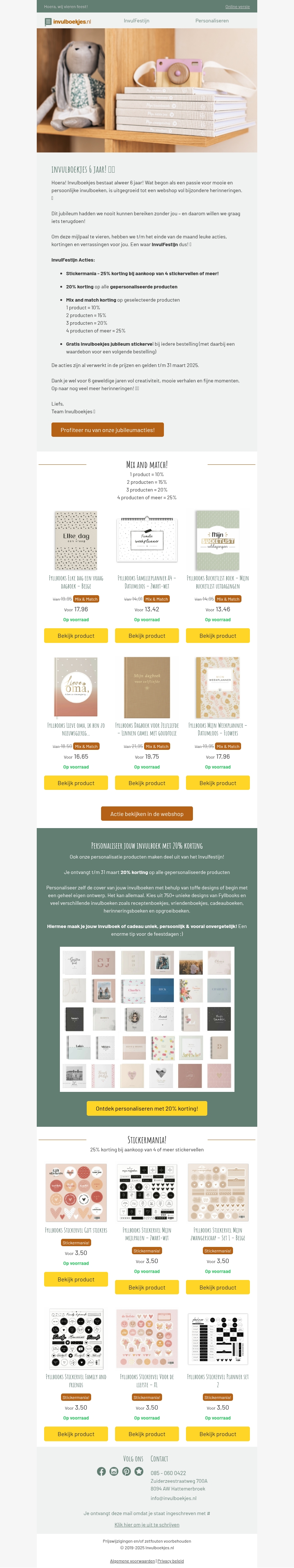 Invulboekjes viert zijn 6-jarig bestaan met speciale jubilea aanbiedingen. Geniet van 25% korting op geselecteerde stickers en gepersonaliseerde producten. Mis onze mix en match deals niet voor extra voordelen. Personaliseer jouw producten met 20% korting tot en met 31 maart 2023. Profiteer nu van onze jubileumacties en maak unieke invulboekjes voor al je herinneringen.