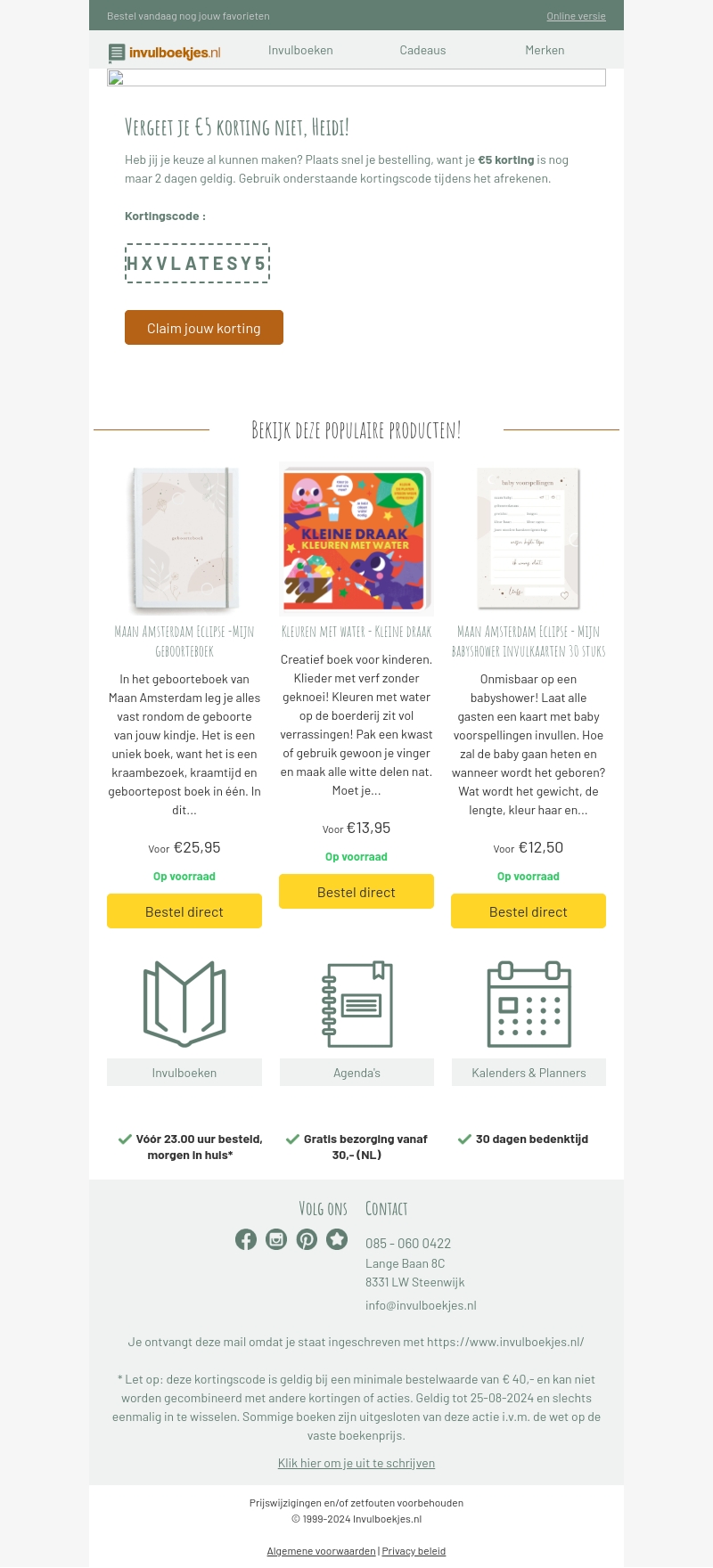 Krijg โฌ5 korting op je volgende aankoop bij Invulboekjes.nl! Gebruik de kortingscode HVXLATESY5 bij het afrekenen. Deze aanbieding is nog maar 2 dagen geldig. Bekijk ook onze populaire producten zoals het geboorteboek en babyshower invulkaarten. Bestel vรณรณr 23.00 uur voor levering morgen in huis.