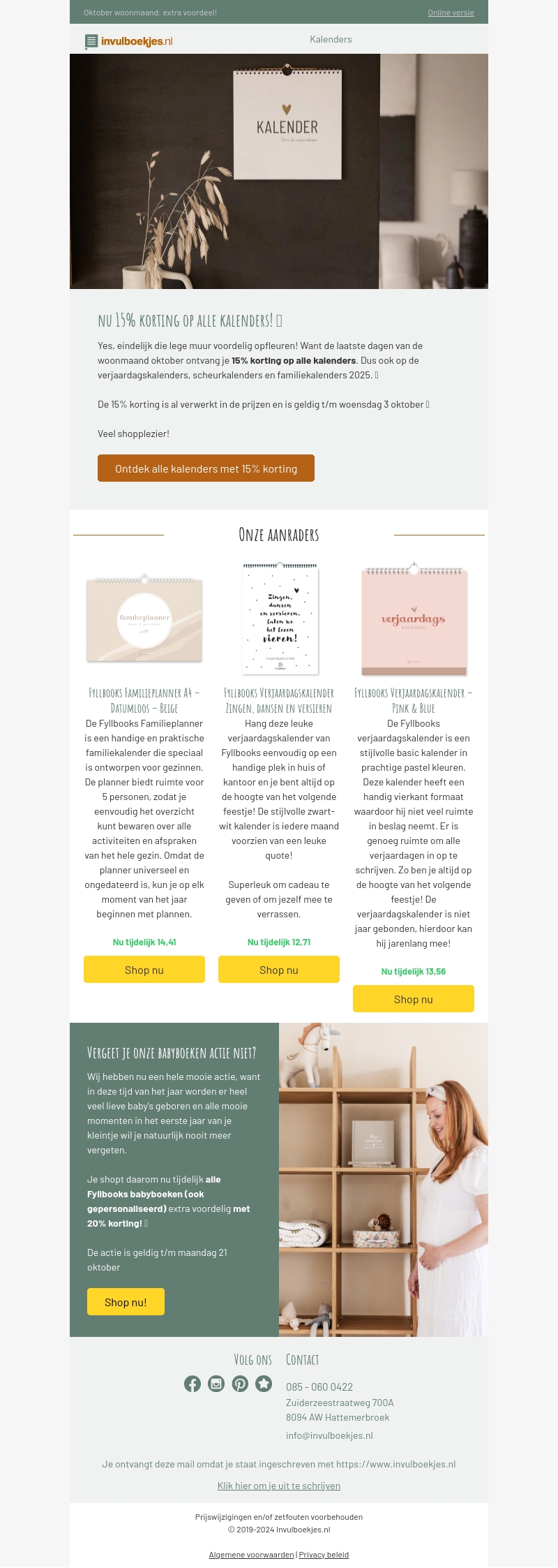 De oktober woonmaand biedt u nu 15% korting op alle kalenders. Van familieplanners tot verjaardagskalenders, er is voor ieder wat wils. De actie loopt tot woensdag 3 oktober. Mis deze kans niet om uw huis op te vrolijken met stijlvolle kalenders. Shop nu eenvoudig online en geniet van de kortingen.