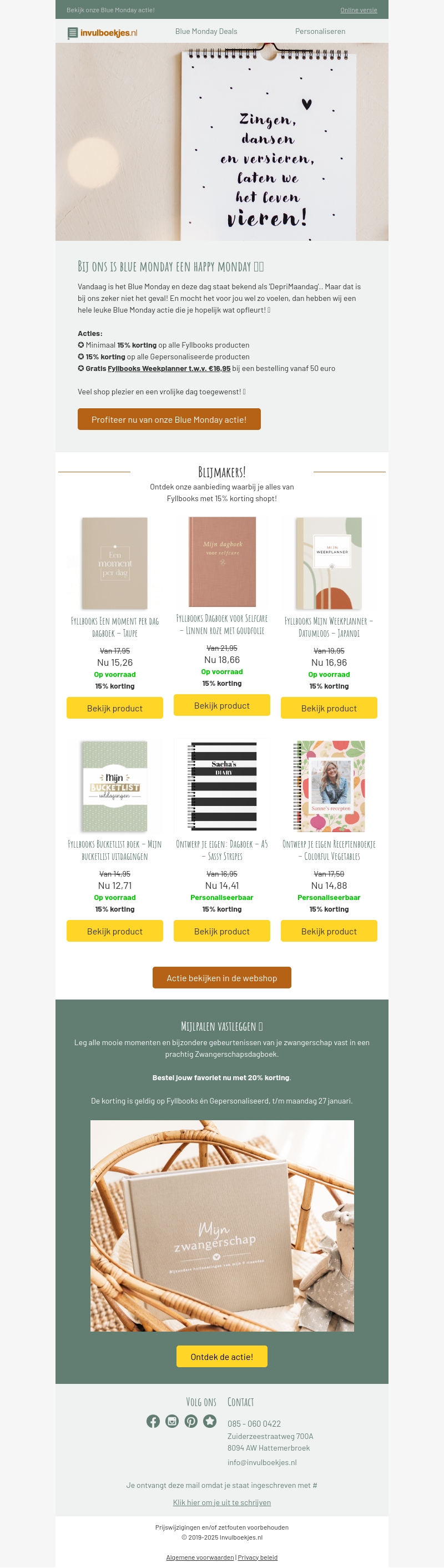 Vandaag is het Blue Monday, maar bij invulboekjes.nl maken we er een Happy Monday van! Profiteer van minimaal 15% korting op alle Fyllbooks producten en ontvang een gratis weekplanner. Deze geweldige deal geldt maar tot 50 euro, dus mis het niet. Daarnaast kun je jouw favoriete zwangerschapsdagboek bestellen met 20% korting.