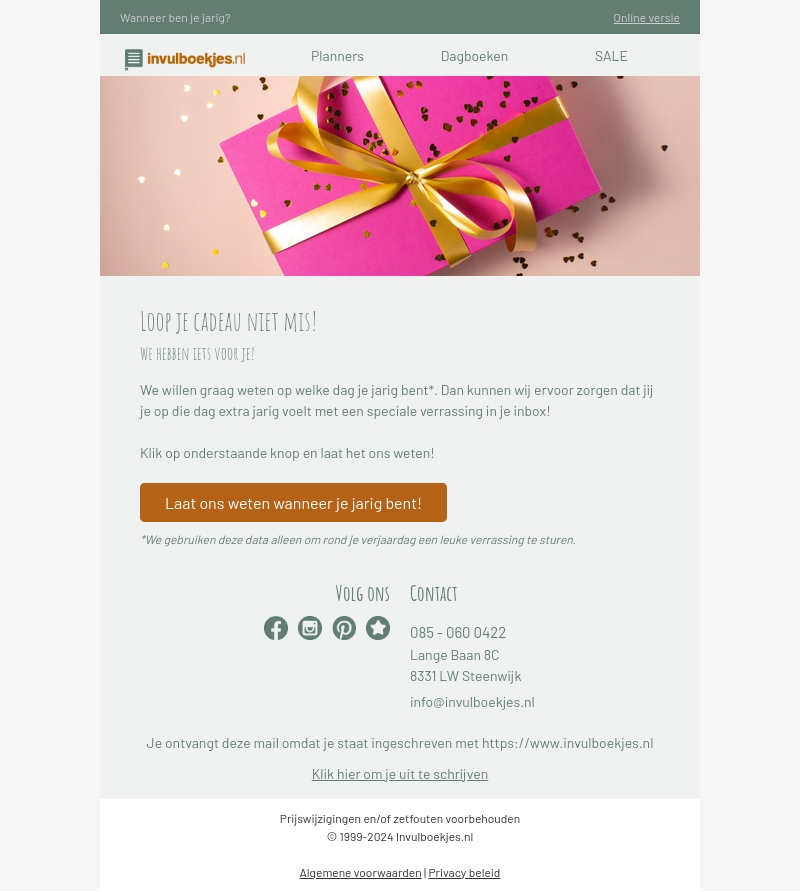 Ontdek het plezier van een persoonlijke verjaardagssurprise bij Invulboekjes.nl. Vul je geboortedatum in en maak je klaar voor iets speciaals in jouw inbox. We gebruiken deze datum alleen om een leuke verjaardag verrassing te sturen. Deel je speciale dag met ons en laat je verrassen!